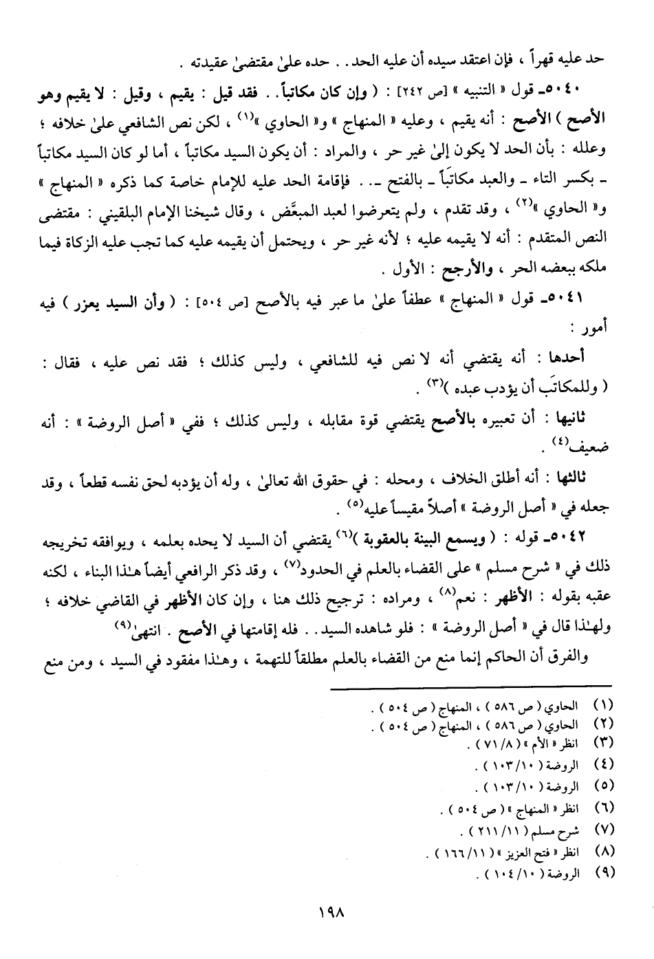 5040 - قول "التنبيه" [ص 242]: (وإن كان مكاتبًا .. فقد قيل: يقيم، وقيل: لا يقيم وهو الأصح) الأصح: أنَّه يقيم، وعليه "المنهاج" و"الحاوي" (¬1)، لكن نص الشَّافعي على خلافه؛ وعلله: بأن الحد لا يكون إلى غير حر، والمراد: أن يكون السيد مكاتبًا، أما لو كان السيد مكاتبًا - بكسر التاء - والعبد مكاتَبًا - بالفتح - .. فإقامة الحد عليه للإمام خاصة كما ذكره "المنهاج" و"الحاوي" (¬2)، وقد تقدم، ولم يتعرضوا لعبد المبعَّض، وقال شيخنا الإمام البلقيني: مقتضى النص المتقدم: أنَّه لا يقيمه عليه؛ لأنه غير حر، ويحتمل أن يقيمه عليه كما تجب عليه الزكاة فيما ملكه ببعضه الحر، والأرجح: الأول.