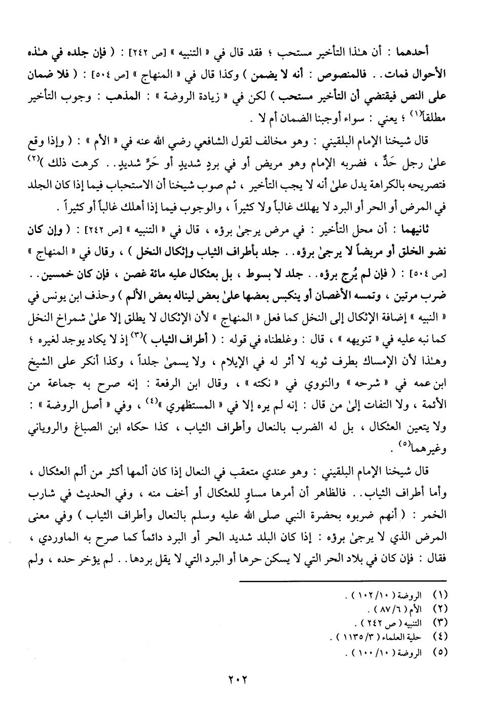 قال شيخنا الإمام البلقيني: وهو عندي متعقب في النعال إذا كان ألمها أكثر من ألم العثكال، وأما أطراف الثياب .. فالظاهر أن أمرها مساو للعثكال أو أخف منه، وفي الحديث في شارب الخمر: (أنهم ضربوه بحضرة النبي صلى الله عليه وسلم بالنعال وأطراف الثياب) وفي معنى المرض الذي لا يرجى برؤه: إذا كان البلد شديد الحر أو البرد دائما كما صرح به الماوردي، فقال: فإن كان في بلاد الحر التي لا يسكن حرها أو البرد التي لا يقل بردها .. لم يؤخر حده، ولم