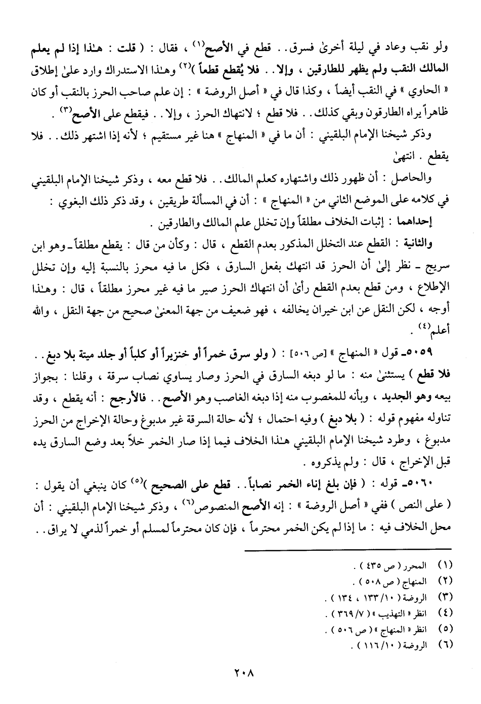 5059 - قول "المنهاج" [ص 506]: (ولو سرق خمرًا أو خنزيرًا أو كلبًا أو جلد ميتة بلا دبغ .. فلا قطع) يستثنى منه: ما لو دبغه السارق في الحرز وصار يساوي نصاب سرقة، وقلنا: بجواز بيعه وهو الجديد، وبأنه للمغصوب منه إذا دبغه الغاصب وهو الأصح .. فالأرجح: أنَّه يقطع، وقد تناوله مفهوم قوله: (بلا دبغ) وفيه احتمال؛ لأنه حالة السرقة غير مدبوغ وحالة الإخراج من الحرز مدبوغ، وطرد شيخنا الإمام البلقيني هذا الخلاف فيما إذا صار الخمر خلًّا بعد وضع السارق يده قبل الإخراج، قال: ولم يذكروه.