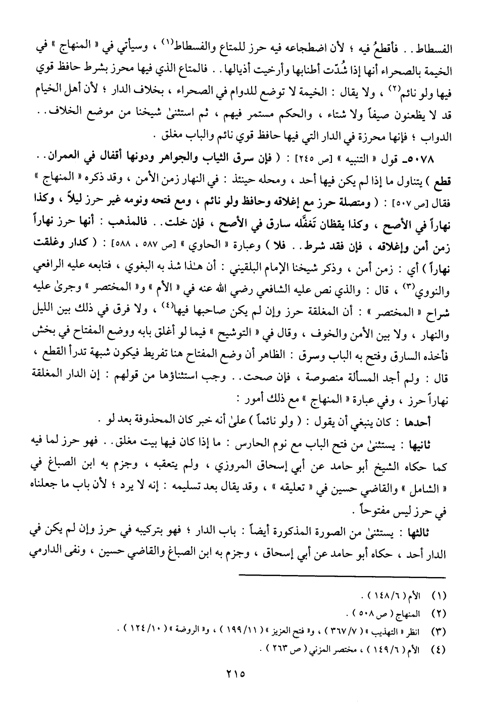 5078 - قول "التنبيه" [ص 245]: (فإن سرق الثياب والجواهر ودونها أقفال في العمران .. قطع) يتناول ما إذا لم يكن فيها أحد، ومحله حينئذ: في النهار زمن الأمن، وقد ذكره "المنهاج" فقال [ص 507]: (ومتصلة حرز مع إغلاقه وحافظ ولو نائم، ومع فتحه ونومه غير حرز ليلًا، وكذا نهارًا في الأصح، وكذا يقظان تَغفَّله سارق في الأصح، فإن خلت .. فالمذهب: أنَّها حرز نهارًا زمن أمن وإغلاقه، فإن فقد شرط .. فلا) وعبارة "الحاوي" [ص 587، 588]: (كدار وغلقت نهارًا) أي: زمن أمن، وذكر شيخنا الإمام البلقيني: أن هذا شذ به البغوي، فتابعه عليه الرافعي والنووي (¬3)، قال: والذي نص عليه الشَّافعي رضي الله عنه في "الأم" و"المختصر" وجرى عليه شراح"المختصر ": أن المغلقة حرز وإن لم يكن صاحبها فيها (¬4)، ولا فرق في ذلك بإن الليل والنهار، ولا بين الأمن والخوف، وقال في "التوشيح" فيما لو أغلق بابه ووضع المفتاح في بخش فأخذه السارق وفتح به الباب وسرق: الظاهر أن وضع المفتاح هنا تفريط فيكون شبهة تدرأ القطع، قال: ولم أجد المسألة منصوصة، فإن صحت .. وجب استثناؤها من قولهم: إن الدار المغلقة نهارًا حرز، وفي عبارة "المنهاج" مع ذلك أمور: