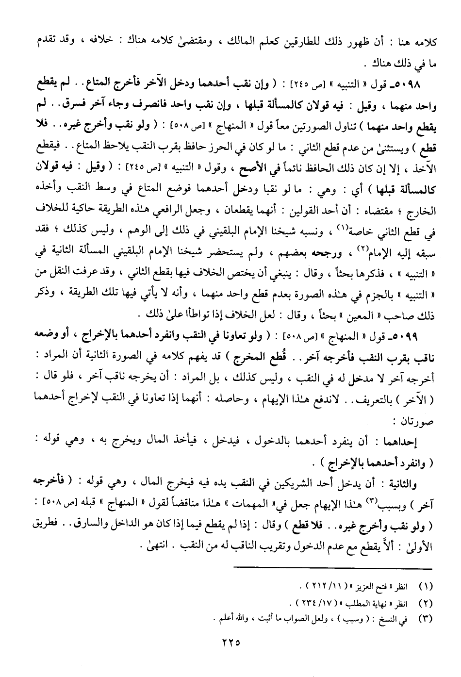 5099 - قول "المنهاج" [ص 508]: (ولو تعاونا في النقب وانفرد أحدهما بالإخراج، أو وضعه ناقب بقرب النقب فأخرجه آخر .. قُطع المخرج) قد يفهم كلامه في الصورة الثانية أن المراد: أخرجه آخر لا مدخل له في النقب، وليس كذلك، بل المراد: أن يخرجه ناقب آخر، فلو قال: (الآخر) بالتعريف .. لاندفع هذا الإيهام، وحاصله: أنهما إذا تعاونا في النقب لإخراج أحدهما صورتان: