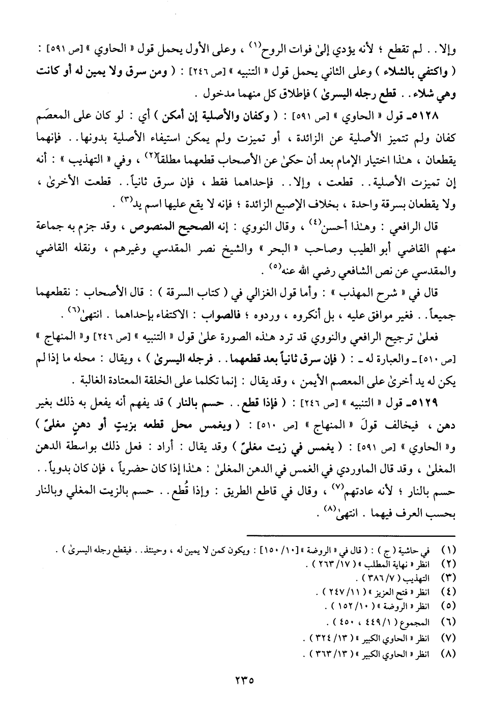 5129 - قول "التنبيه" [ص 246]: (فإذا قطع .. حسم بالنار) قد يفهم أنَّه يفعل به ذلك بغير دهن، فيخالف قولَ "المنهاج" [ص 510]: (ويغمس محل قطعه بزيتٍ أو دهنٍ مغلىً) و"الحاوي" [ص 591]: (يغمس في زيت مغلىً) وقد يقال: أراد: فعل ذلك بواسطة الدهن المغلى، وقد قال الماوردي في الغمس في الدهن المغلى: هذا إذا كان حضريًا، فإن كان بدويا .. حسم بالنار؛ لأنه عادتهم (¬7)، وقال في قاطع الطَّرِيقِ: وإذا قُطع .. حسم بالزيت المغلي وبالنار بحسب العرف فيهما. انتهى (¬8).