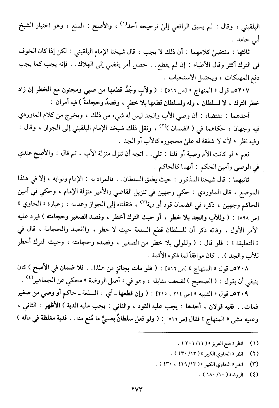 ثانيهما: قال شيخنا المذكور: حيث يطلق السلطان .. فالمراد به: الإمام ونوابه، إلَّا في هذا الموضع، قال الماوردي: حكي وجهين في تنزيل القاضي والأمير منزلة الإمام، وحكى في أمين الحاكم وجهين، ذكره في الضمان قود أو دية (¬3)، فنقلناه إلى الجواز وعدمه، وعبارة "الحاوي" [ص 598]: (وللأب والجد بلا خطر، أو حيث الترك أخطر، وفصد الصغير وحجامته) فيرد عليه الأمر الأول، وفاته ذكر أن للسلطان قطع السلعة حيث لا خطر، والفصد والحجامة، قال في "التعليقة": فلو قال: (وللولي بلا خطر من الصغير، وفصده وحجامته، وحيث الترك أخطر للأب والجد) .. كان موافقًا لما ذكره الأئمة.