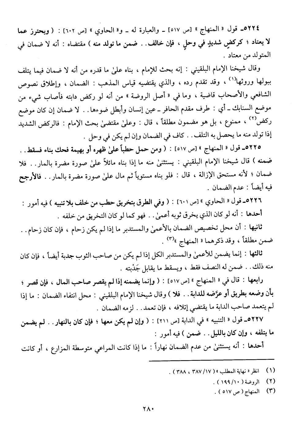 5225 - قول "المنهاج" [ص 517]: (ومن حمل حطبًا على ظهره أو بهيمة فحك بناء فسقط .. ضمنه) قال شيخنا الإمام البلقيني: يستثنى منه ما إذا بناه مائلًا على صورة مضرة بالمار .. فلا ضمان؛ لأنه مستحق الإزالة، قال: فلو بناه مستويًا ثم مال على صورة مضرة بالمار .. فالأرجح فيه أيضًا: عدم الضمان.