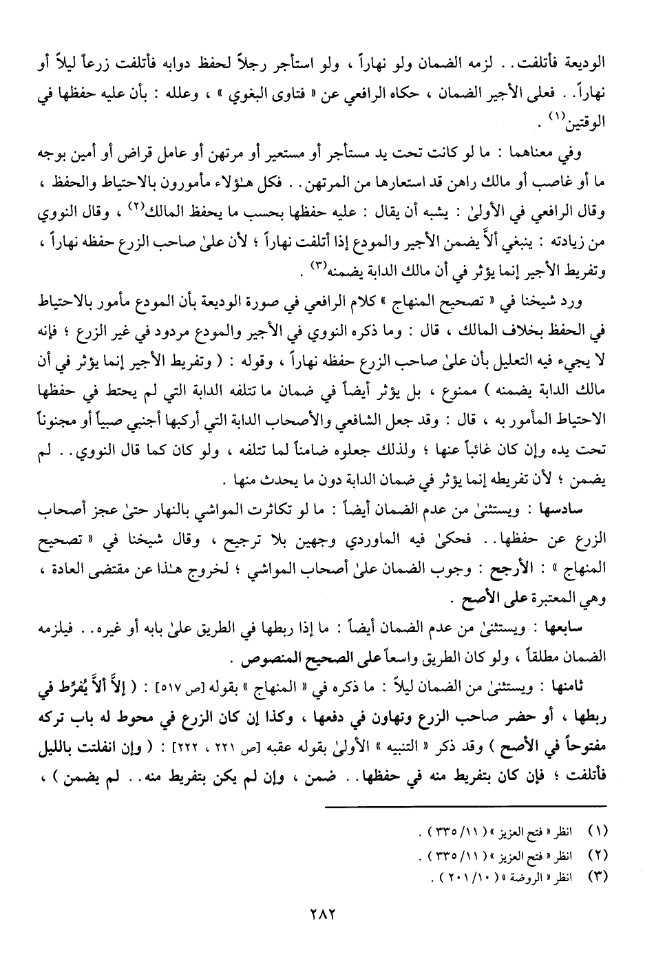 ثامنها: ويستثنى من الضمان ليلاً: ما ذكره في "المنهاج" بقوله [ص 517]: (إلاَّ ألاَّ يُفرط في ربطها، أو حضر صاحب الزرع وتهاون في دفعها، وكذا إن كان الزرع في محوط له باب تركه مفتوحاً في الأصح) وقد ذكر "التنبيه" الأولى بقوله عقبه [ص 221، 222]: (وإن انفلتت بالليل فأتلفت؛ فإن كان بتفريط منه في حفظها .. ضمن، وإن لم يكن بتفريط منه .. لم يضمن)،
