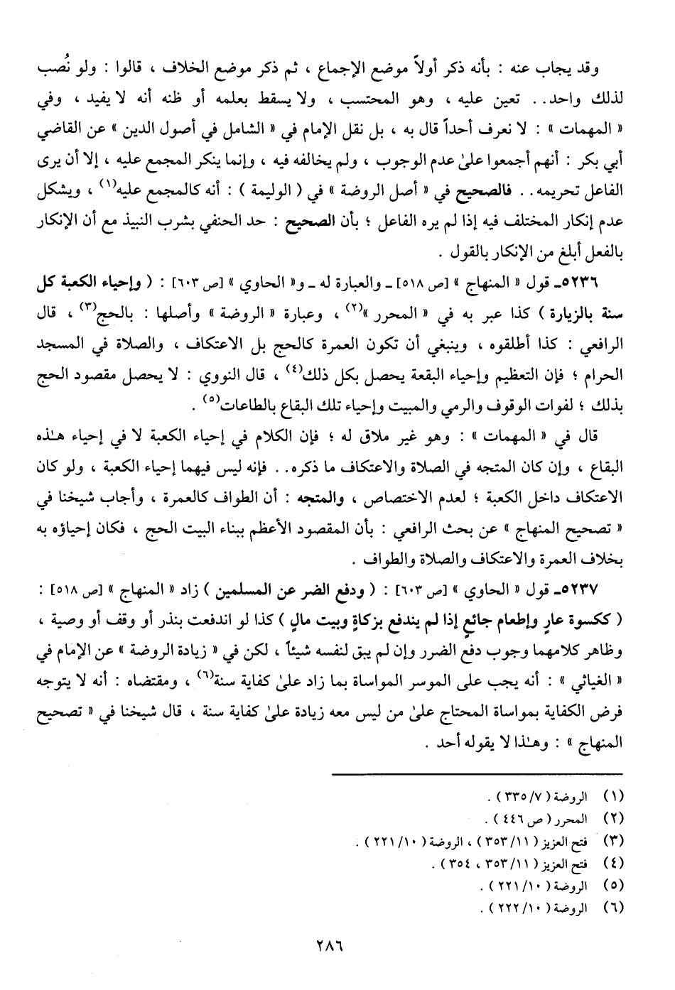 5236 - قول "المنهاج" [ص 518]- والعبارة له - و"الحاوي" [ص 603]: (وإحياء الكعبة كل سنة بالزيارة) كذا عبر به في "المحرر" (¬2)، وعبارة "الروضة" وأصلها: بالحج (¬3)، قال الرافعي: كذا أطلقوه، وينبغي أن تكون العمرة كالحج بل الاعتكاف، والصلاة في المسجد الحرام؛ فإن التعظيم وإحياء البقعة يحصل بكل ذلك (¬4)، قال النووي: لا يحصل مقصود الحج بذلك؛ لفوات الوقوف والرمي والمبيت وإحياء تلك البقاع بالطاعات (¬5).