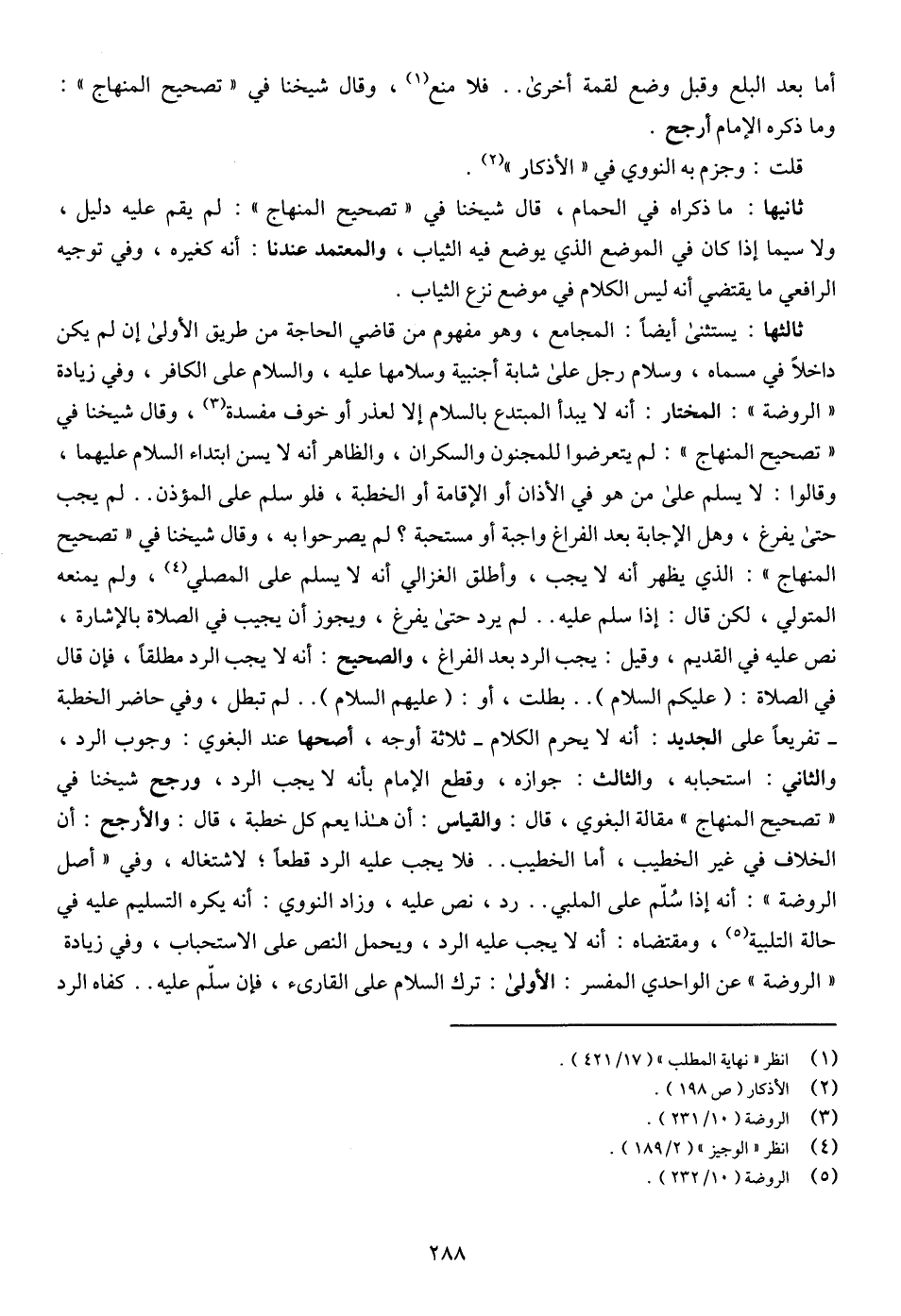 ثانيها: ما ذكراه في الحمام، قال شيخنا في "تصحيح المنهاج": لم يقم عليه دليل، ولا سيما إذا كان في الموضع الذي يوضع فيه الثياب، والمعتمد عندنا: أنه كغيره، وفي توجيه الرافعي ما يقتضي أنه ليس الكلام في موضع نزع الثياب. ثالثها: يستثنى أيضًا: المجامع، وهو مفهوم من قاضي الحاجة من طريق الأولى إن لم يكن داخلأ في مسماه، وسلام رجل على شابة أجنبية وسلامها عليه، والسلام على الكافر، وفي زيادة "الروضة": المختار: أنه لا يبدأ المبتدع بالسلام إلا لعذر أو خوف مفسدة (¬3)، وقال شيخنا في "تصحيح المنهاج": لم يتعرضوا للمجنون والسكران، والظاهر أنه لا يسن ابتداء السلام عليهما، وقالوا: لا يسلم على من هو في الأذان أو الإقامة أو الخطبة، فلو سلم على المؤذن .. لم يجب حتى يفرغ، وهل الإجابة بعد الفراغ واجبة أو مستحبة؛ لم يصرحوا به، وقال شيخنا في "تصحيح المنهاج": الذي يظهر أنه لا يجب، وأطلق الغزالي أنه لا يسلم على المصلي (¬4)، ولم يمنعه المتولي، لكن قال: إذا سلم عليه .. لم يرد حتى يفرغ، ويجوز أن يجيب في الصلاة بالإشارة، نص عليه في القديم، وقيل: يجب الرد بعد الفراغ، والصحيح: أنه لا يجب الرد مطلقًا، فإن قال في الصلاة: (عليكم السلام) .. بطلت، أو: (عليهم السلام) .. لم تبطل، وفي حاضر الخطبة - تفريعا على الجديد: أنه لا يحرم الكلام - ثلاثة أوجه، أصحها عند البغوي: وجوب الرد، والثاني: استحبابه، والثالث: جوازه، وقطع الإمام بأنه لا يجب الرد، ورجح شيخنا في "تصحيح المنهاج" مقالة البغوي، قال: والقياس: أن هذا يعم كل خطبة، قال: والأرجح: أن الخلاف في غير الخطيب، أما الخطيب .. فلا يجب عليه الرد قطعا؛ لاشتغاله، وفي "أصل الروضة": أنه إذا سُلّم على الملبي .. رد، نص عليه، وزاد النووي: أنه يكره التسليم عليه في حالة التلبية (¬5)، ومقتضاه: أنه لا يجب عليه الرد، ويحمل النص على الاستحباب، وفي زيادة "الروضة" عن الواحدي المفسر: الأولى: ترك السلام على القارئ، فإن سلّم عليه .. كفاه الرد