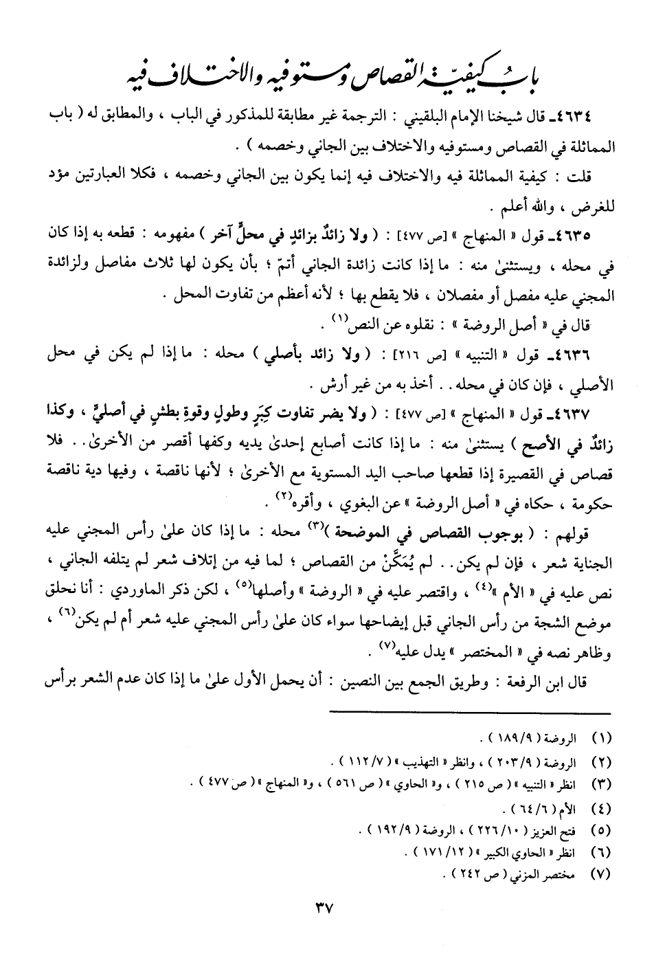 4637 - قول " المنهاج " [ص 477]: (ولا يضر تفاوت كِبَرٍ وطولٍ وقوةِ بطشٍ في أصليٍّ، وكذا زائدٌ في الأصح) يستثنى منه: ما إذا كانت أصابع إحدى يديه وكفها أقصر من الأخرى .. فلا قصاص في القصيرة إذا قطعها صاحب اليد المستوية مع الأخرى؛ لأنها ناقصة، وفيها دية ناقصة حكومة، حكاه في " أصل الروضة " عن البغوي، وأقره (¬2).
