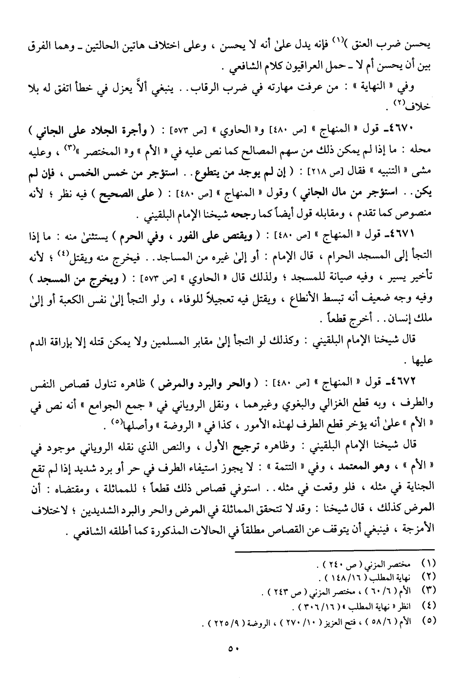 4672 - قول " المنهاج " [ص 480]: (والحر والبرد والمرض) ظاهره تناول قصاص النفس والطرف، وبه قطع الغزالي والبغوي وغيرهما، ونقل الروياني في " جمع الجوامع " أنه نص في " الأم " على أنه يؤخر قطع الطرف لهذه الأمور، كذا في " الروضة " وأصلها (¬5).