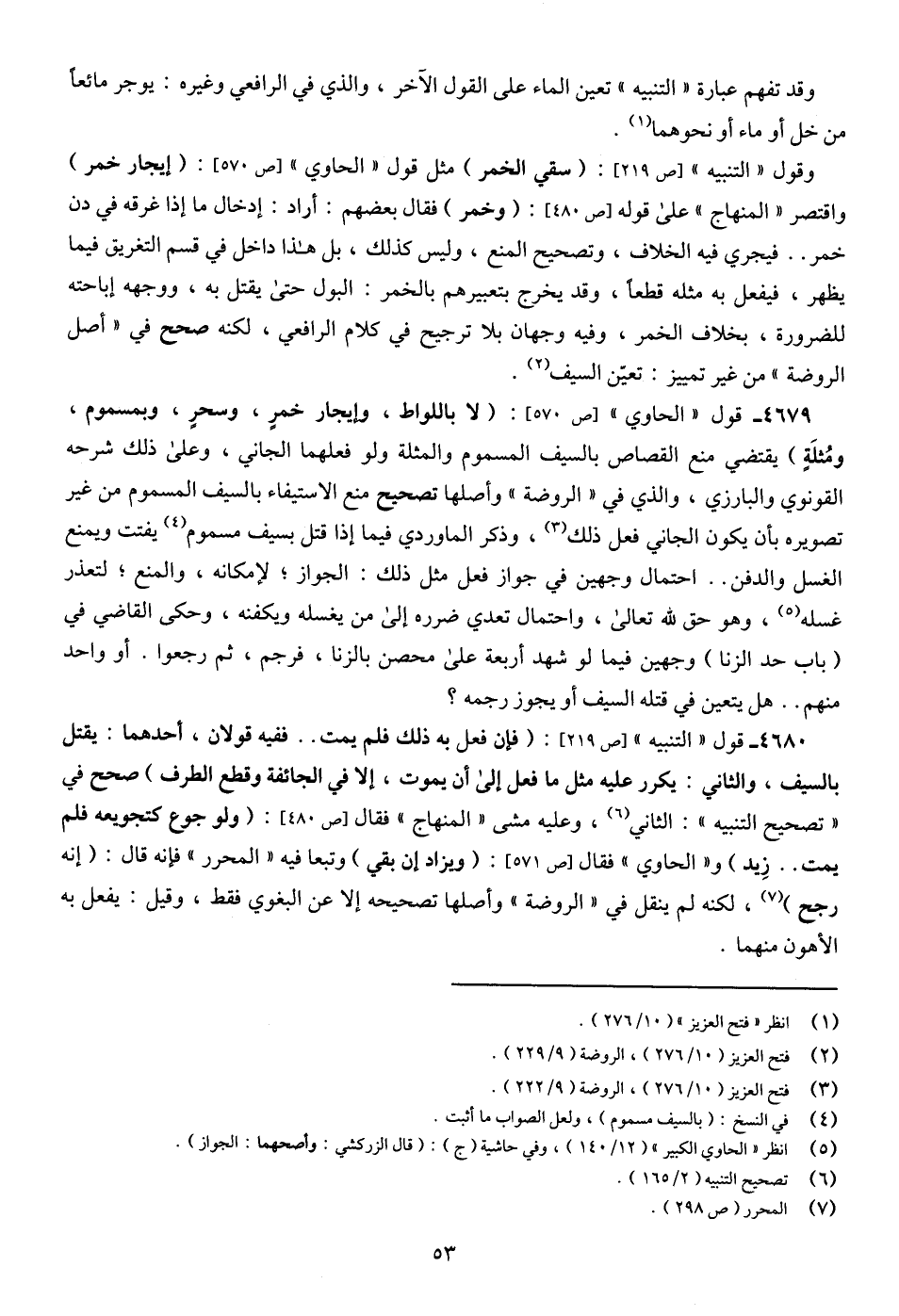 وقول " التنبيه " [ص 219]: (سقي الخمر) مثل قول " الحاوي " [ص 570]: (إيجار خمر) واقتصر " المنهاج " على قوله [ص 480]: (وخمر) فقال بعضهم: أراد: إدخال ما إذا غرقه في دن خمر .. فيجري فيه الخلاف، وتصحيح المنع، وليس كذلك، بل هذا داخل في قسم التغريق فيما يظهر، فيفعل به مثله قطعًا، وقد يخرج بتعبيرهم بالخمر: البول حتى يقتل به، ووجهه إباحته للضرورة، بخلاف الخمر، وفيه وجهان بلا ترجيح في كلام الرافعي، لكنه صحح في " أصل الروضة " من غير تمييز: تعيّن السيف (¬2).