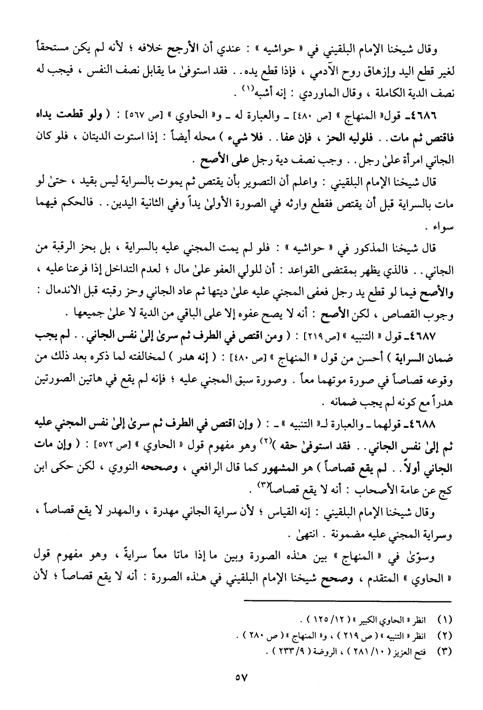 4687 - قول " التنبيه " [ص 219]: (ومن اقتص في الطرف ثم سرى إلى نفس الجاني .. لم يجب ضمان السراية) أحسن من قول " المنهاج " [ص 480]: (إنه هدر) لمخالفته لما ذكره بعد ذلك من وقوعه قصاصًا في صورة موتهما معًا. وصورة سبق المجني عليه؛ فإنه لم يقع في هاتين الصورتين هدرًا مع كونه لم يجب ضمانه.