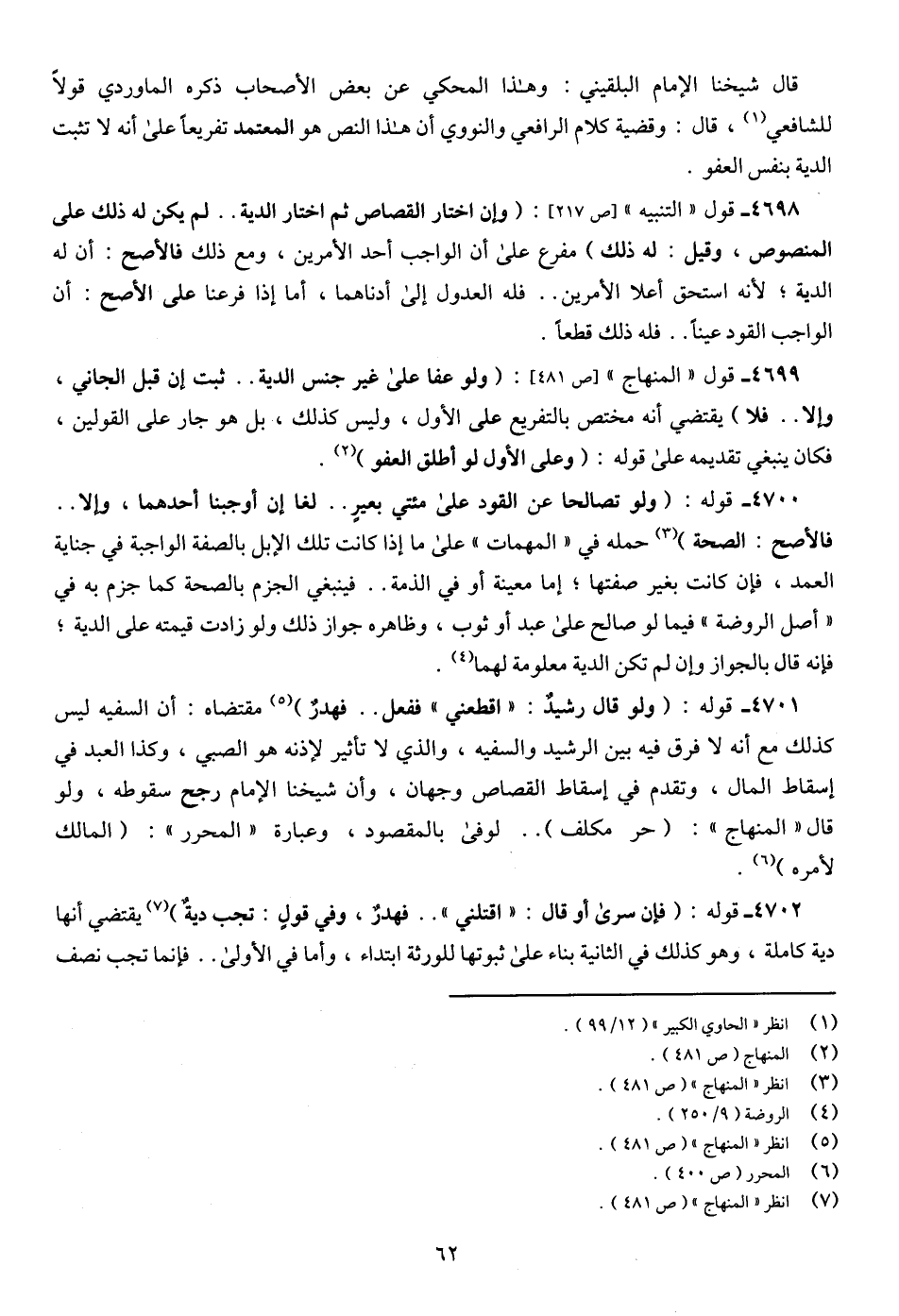 4699 - قول " المنهاج " [ص 481]: (ولو عفا على غير جنس الدية .. ثبت إن قبل الجاني، وإلا .. فلا) يقتضي أنه مختص بالتفريع على الأول، وليس كذلك، بل هو جار على القولين، فكان ينبغي تقديمه على قوله: (وعلى الأول لو أطلق العفو) (¬2).