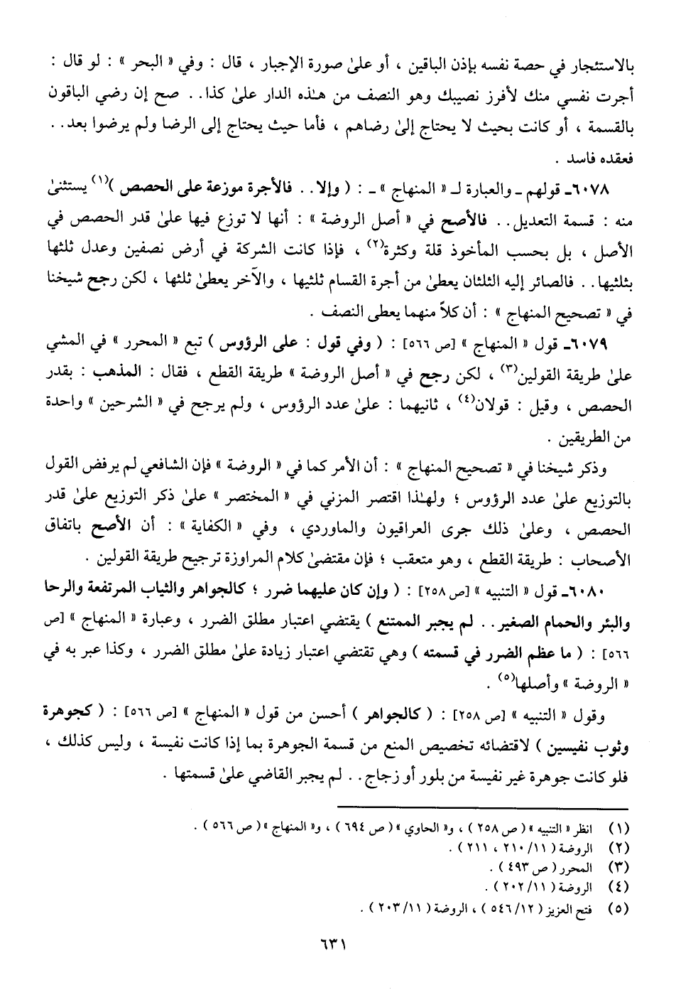 6080 - قول " التنبيه " [ص 258]: (وإن كان عليهما ضرر؛ كالجواهر والثياب المرتفعة والرحا والبئر والحمام الصغير .. لم يجبر الممتنع) يقتضي اعتبار مطلق الضرر، وعبارة " المنهاج " [ص 566]: (ما عظم الضرر في قسمته) وهي تقتضي اعتبار زيادة على مطلق الضرر، وكذا عبر به في " الروضة " وأصلها (¬5).