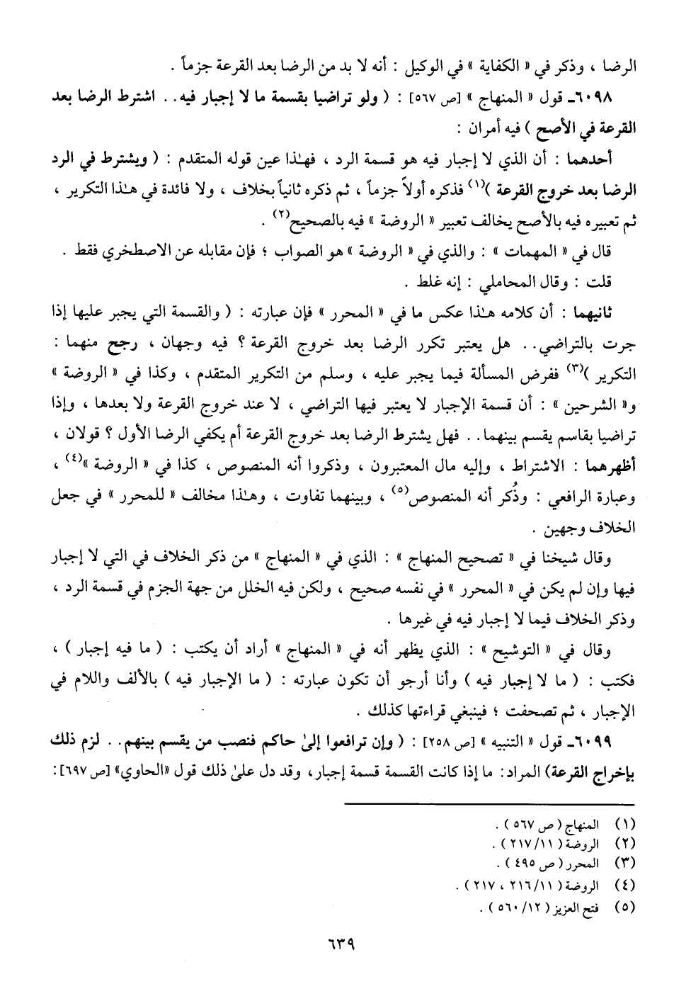6099 - قول " التنبيه " [ص 258]: (وإن ترافعوا إلى حاكم فنصب من يقسم بينهم .. لزم ذلك بإخراج القرعة) المراد: ما إذا كانت القسمة قسمة إجبار، وقد دل على ذلك فول "الحاوي " [ص 697]: