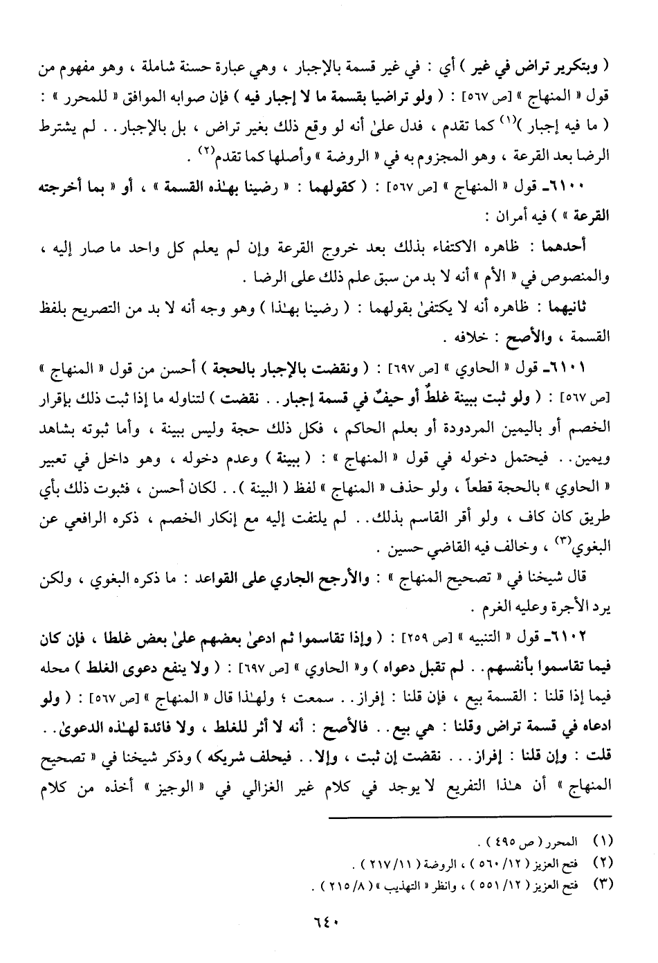 6101 - قول " الحاوي " [ص 697]: (ونقضت بالإجبار بالحجة) أحسن من قول " المنهاج " [ص 567]: (ولو ثبت ببينة غلطٌ أو حيفٌ في قسمة إجبار .. نقضت) لتناوله ما إذا ثبت ذلك بإقرار الخصم أو باليمين المردودة أو بعلم الحاكم، فكل ذلك حجة وليس ببينة، وأما ثبوته بشاهد ويمين .. فيحتمل دخوله في قول " المنهاج ": (ببينة) وعدم دخوله، وهو داخل في تعبير " الحاوي " بالحجة قطعًا، ولو حذف " المنهاج " لفظ (البينة) .. لكان أحسن، فثبوت ذلك بأي طريق كان كاف، ولو أقر القاسم بذلك .. لم يلتفت إليه مع إنكار الخصم، ذكره الرافعي عن البغوي (¬3)، وخالف فيه القاضي حسين.