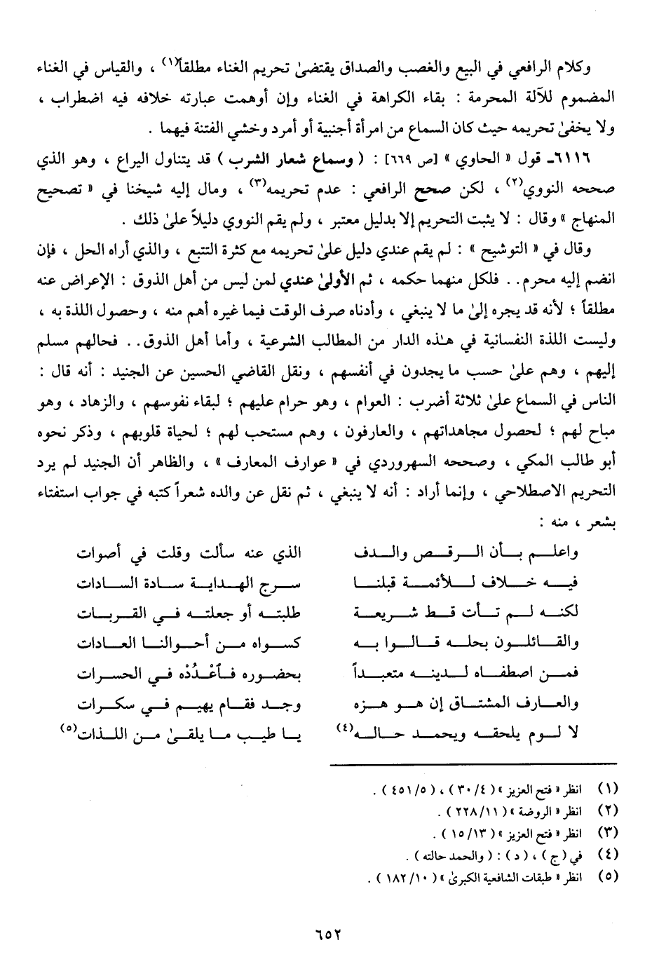 وقال في " التوشيح ": لم يقم عندي دليل على تحريمه مع كثرة التتبع، والذي أراه الحل، فإن انضم إليه محرم .. فلكل منهما حكمه، ثم الأولى عندي لمن ليس من أهل الذوق: الإعراض عنه مطلقًا؛ لأنه قد يجره إلى ما لا ينبغي، وأدناه صرف الوقت فيما غيره أهم منه، وحصول اللذة به، وليست اللذة النفسانية في هذه الدار من المطالب الشرعية، وأما أهل الذوق .. فحالهم مسلم إليهم، وهم على حسب ما يجدون في أنفسهم، ونقل القاضي الحسين عن الجنيد: أنه قال: الناس في السماع على ثلاثة أضرب: العوام، وهو حرام عليهم؛ لبقاء نفوسهم، والزهاد، وهو مباح لهم؛ لحصول مجاهداتهم، والعارفون، وهم مستحب لهم؛ لحياة قلوبهم، وذكر نحوه أبو طالب المكي، وصححه السهروردي في " عوارف المعارف "، والظاهر أن الجنيد لم يرد التحريم الاصطلاحي، وإنما أراد: أنه لا ينبغي، ثم نقل عن والده شعرًا كتبه في جواب استفتاء بشعر، منه:
