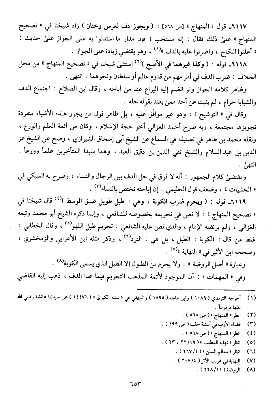 6117 - قول " المنهاج " [ص 568]: (ويجوز دف لعرس وختان) زاد شيخنا في " تصحيح المنهاج " على ذلك فقال: إنه مستحب؛ فإن مدار ما استدلوا به على الجواز على حديث: " أعلنوا النكاح، واضربوا عليه بالدف" (¬1)، وهو يقتضي زيادة على الجواز.