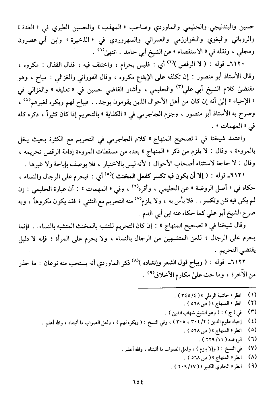 6125 - قوله: (لا الرقص) (¬2) أي: فليس بحرام، واختلف فيه، فقال القفال: مكروه، وقال الأستاذ أبو منصور: إن تكلفه على الإيقاع مكروه، وقال الفوراني والغزالي: مباح، وهو مقتضى كلام الشيخ أبي على (¬3) والحليمي، وأشار القاضي حسين في " تعليقه " والغزالي في " الإحياء " إلى أنه إن كان من أهل الأحوال الذين يقومون بوجد .. فيباح لهم ويكره لغيرهم (¬4)، وصرح به الأستاذ أبو منصور، وجزم الجاجرمي في " الكفاية " بالتحريم إذا كان كثيرًا، ذكره كله في " المهمات ".