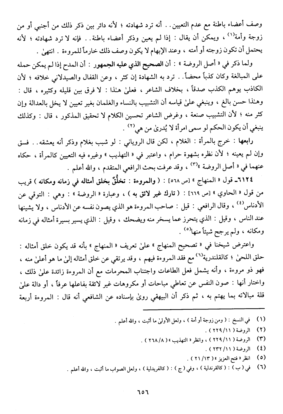 6124 - قول " المنهاج " [ص 568]: (والمروءة: تخلُّقٌ بخلق أمثاله في زمانه ومكانه) قريب من قول " الحاوي " [ص 669]: (تارك غير لائق به)، وعبارة " الروضة ": وهي: التوقي عن الأدناس (¬4)، وقال الرافعي: قيل: صاحب المروءة هو الذي يصون نفسه عن الأدناس، ولا يشينها عند الناس، وقيل: الذي يتحرز عما يسخر منه ويضحك، وقيل: الذي يسير بسيرة أمثاله في زمانه ومكانه، ولم يرجح شيئًا منها (¬5).