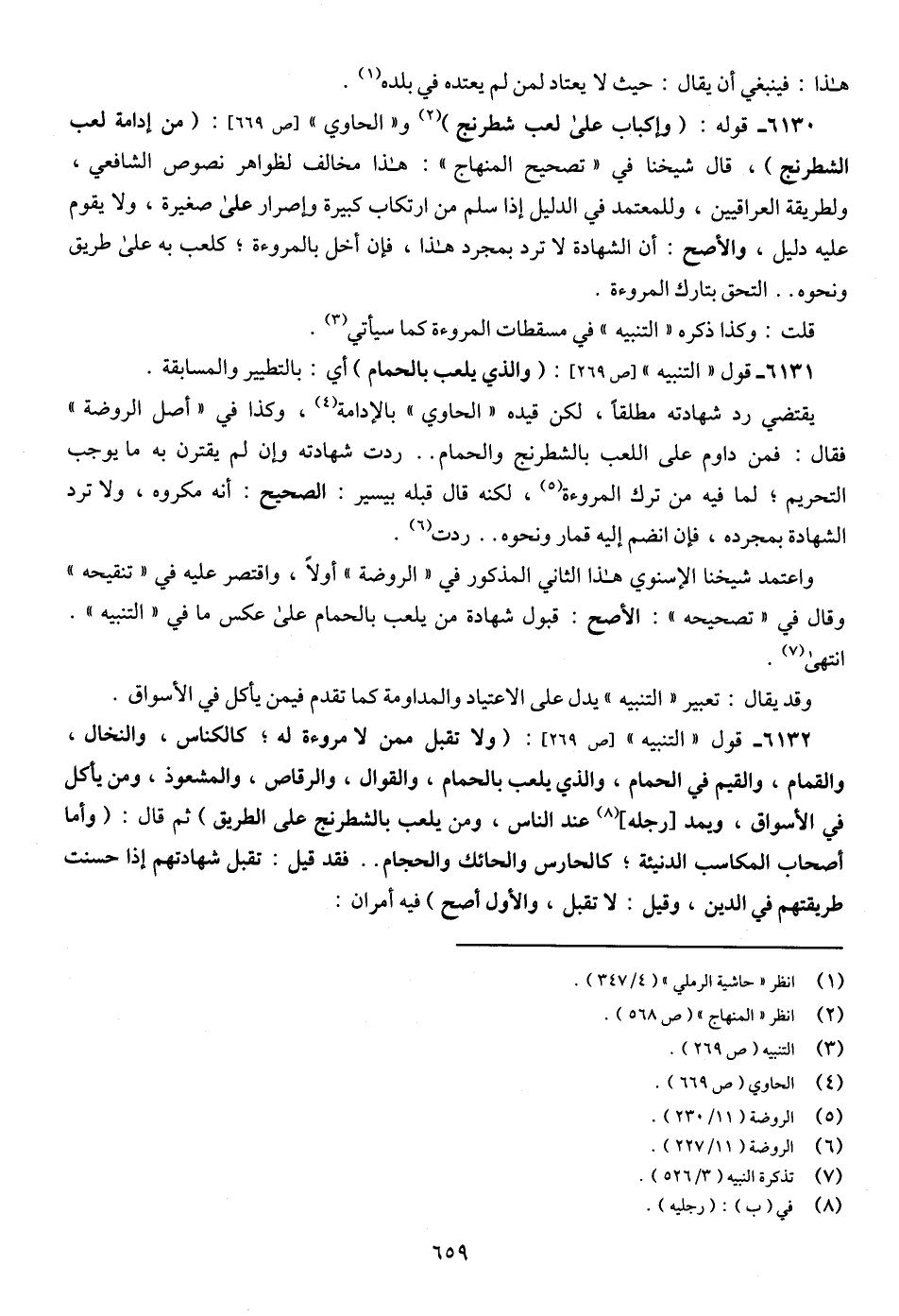 يقتضي رد شهادته مطلقًا، لكن قيده " الحاوي " بالإدامة (¬4)، وكذا في " أصل الروضة " فقال: فمن داوم على اللعب بالشطرنج والحمام .. ردت شهادته وإن لم يقترن به ما يوجب التحريم، لما فيه من ترك المروءة (¬5)، لكنه قال قبله بيسير: الصحيح: أنه مكروه، ولا ترد الشهادة بمجرده، فإن انضم إليه قمار ونحوه .. ردت (¬6).