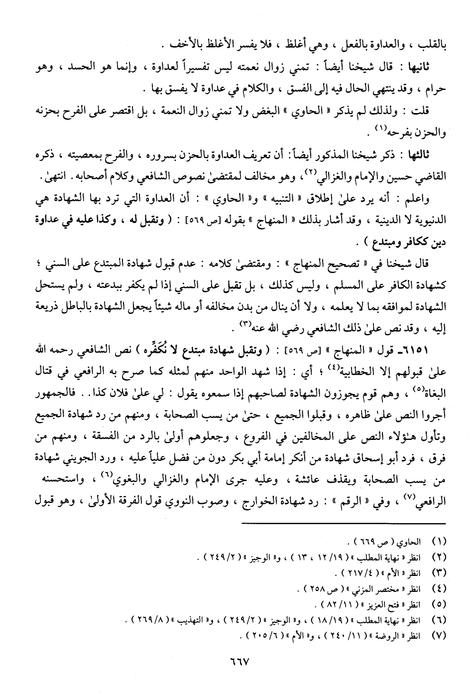 واعلم: أنه يرد على إطلاق " التنبيه " و" الحاوي ": أن العداوة التي ترد بها الشهادة هي الدنيوية لا الدينية، وقد أشار بذلك " المنهاج " بقوله [ص 569]: (وتقبل له، وكذا عليه في عداوة دين ككافر ومبتدع).