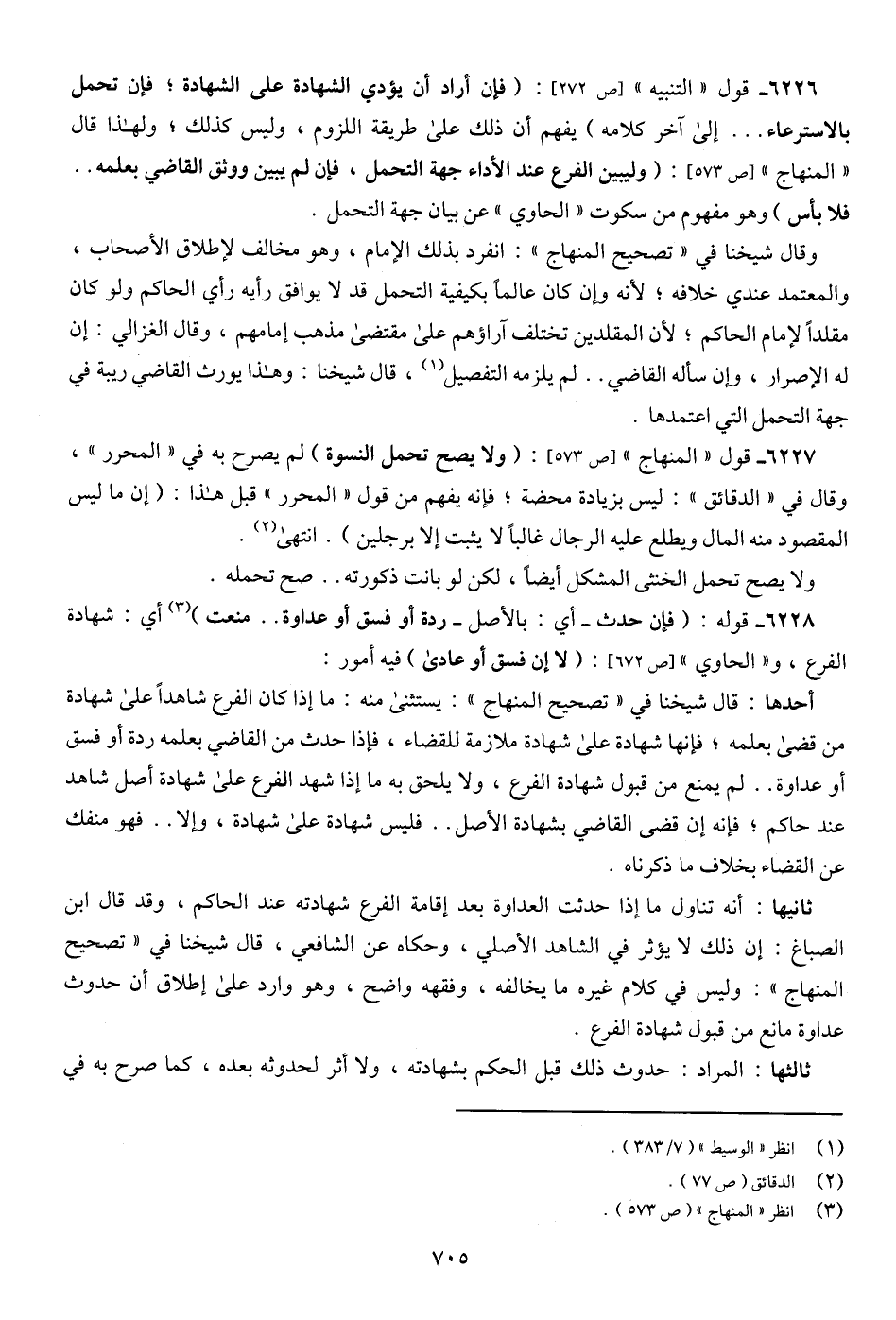 6226 - قول "التنبيه" [ص 272]: (فإن أراد أن يؤدي الشهادة على الشهادة؛ فإن تحمل بالاسترعاء ... إلى آخر كلامه) يفهم أن ذلك على طريقة اللزوم، وليس كذلك؛ ولهذا قال "المنهاج" [ص 573]: (وليبين الفرع عند الأداء جهة التحمل، فإن لم يبين ووثق القاضي بعلمه .. فلا بأس) وهو مفهوم من سكوت "الحاوي" عن بيان جهة التحمل.