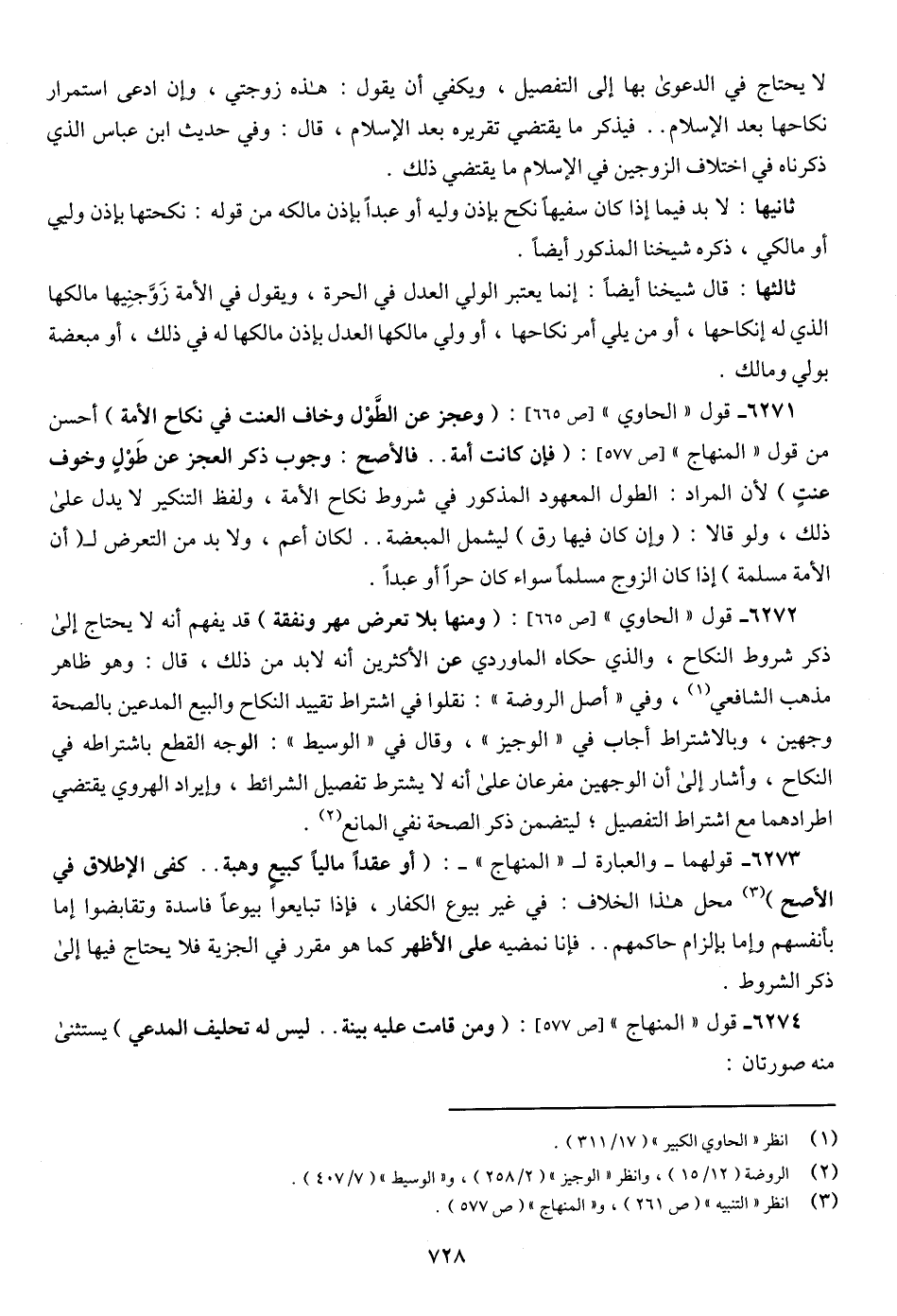 6271 - قول "الحاوي" [ص 665]: (وعجز عن الطَّوْل وخاف العنت في نكاح الأمة) أحسن من قول "المنهاج" [ص 577]: (فإن كانت أمة .. فالأصح: وجوب ذكر العجز عن طَوْلٍ وخوف عنتٍ) لأن المراد: الطول المعهود المذكور في شروط نكاح الأمة، ولفظ التنكير لا يدل على ذلك، ولو قالا: (وإن كان فيها رق) ليشمل المبعضة .. لكان أعم، ولا بد من التعرض لـ (أن الأمة مسلمة) إذا كان الزوج مسلماً سواء كان حراً أو عبداً.