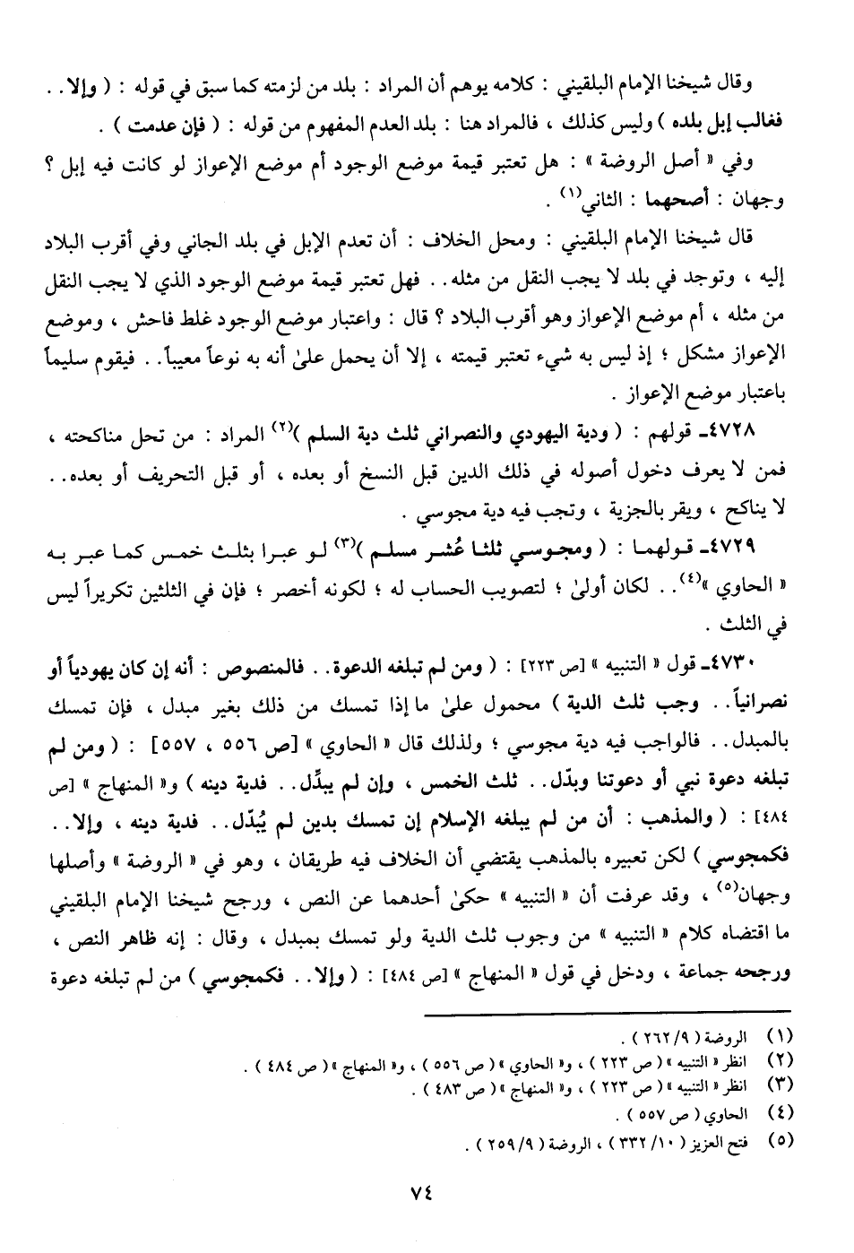 4728 - قولهم: (ودية اليهودي والنصراني ثلث دبة السلم) (¬2) المراد: من تحل مناكحته، فمن لا يعرف دخول أصوله في ذلك الدين قبل النسخ أو بعده، أو قبل التحريف أو بعده .. لا يناكح، ويقر بالجزية، وتجب فيه دية مجوسي.