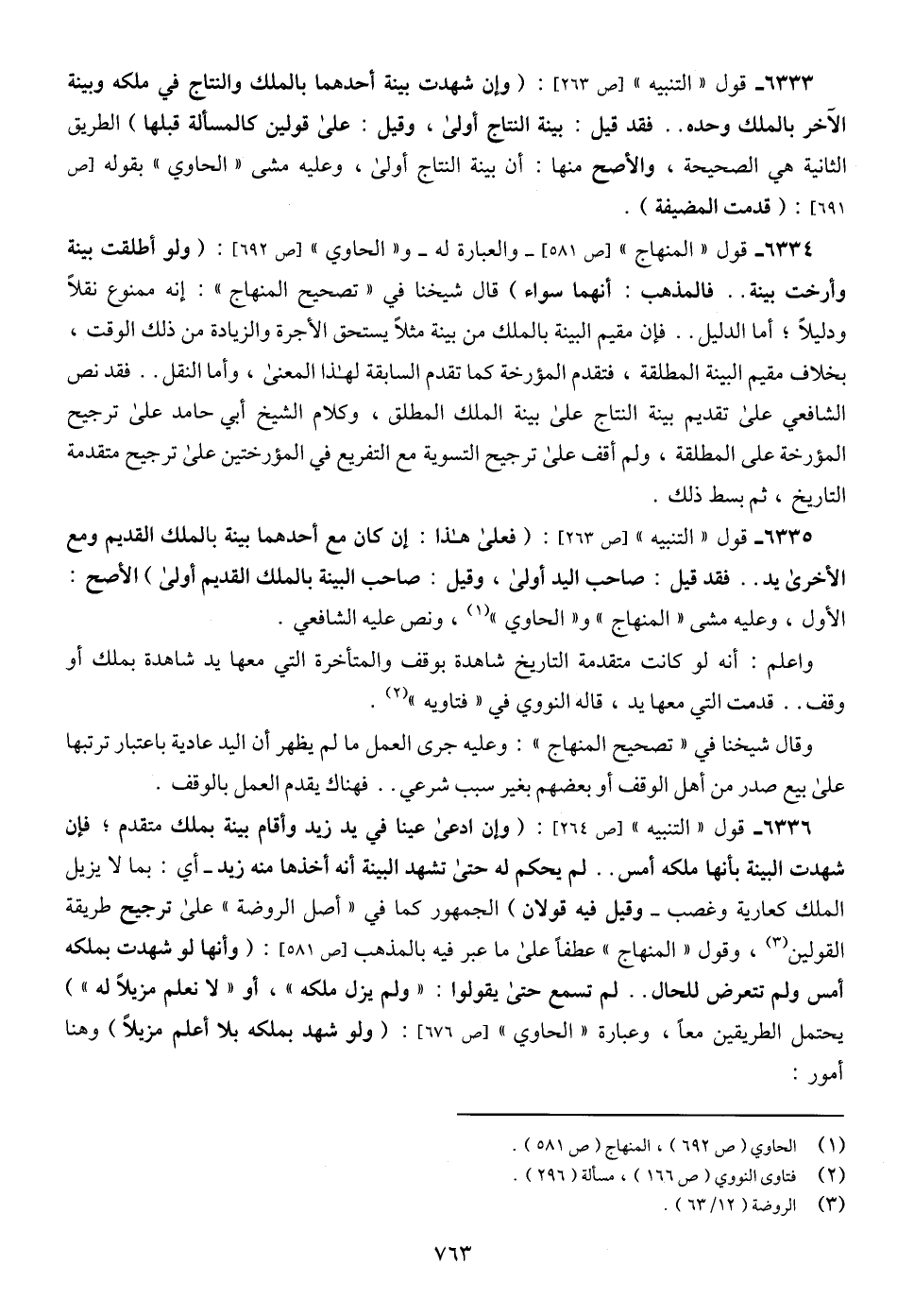 6333 - قول "التنبيه" [ص 263]: (وإن شهدت بينة أحدهما بالملك والنتاج في ملكه وبينة الآخر بالملك وحده .. فقد قيل: بينة النتاج أولى، وقيل: على قولين كالمسألة قبلها) الطريق الثانية هي "الصحيحة" والأصح منها: أن بينة النتاج أولى، وعليه مشى "الحاوي" بقوله [ص 691]: (قدمت المضيفة).