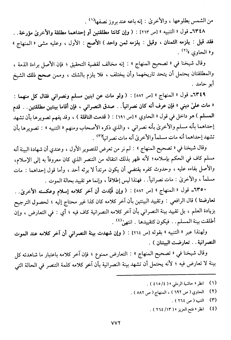 6350 - قول "المنهاج" [ص 582]: (وإن قَيَّدت أن آخر كلامه إسلام وعكسته الأخرى .. تعارضتا) قال الرافعي: وتقييد البينتين بأن آخر كلامه كان كذا غير محتاج إليه؛ لحصول الترجيح بزيادة العلم، بل تقييد بينة النصراني بأن آخر كلامه النصرانية كاف فيه؛ أي: في التعارض، وإن أطلقت بينة المسلم .. فيكون كتقييدها. انتهى (¬4).