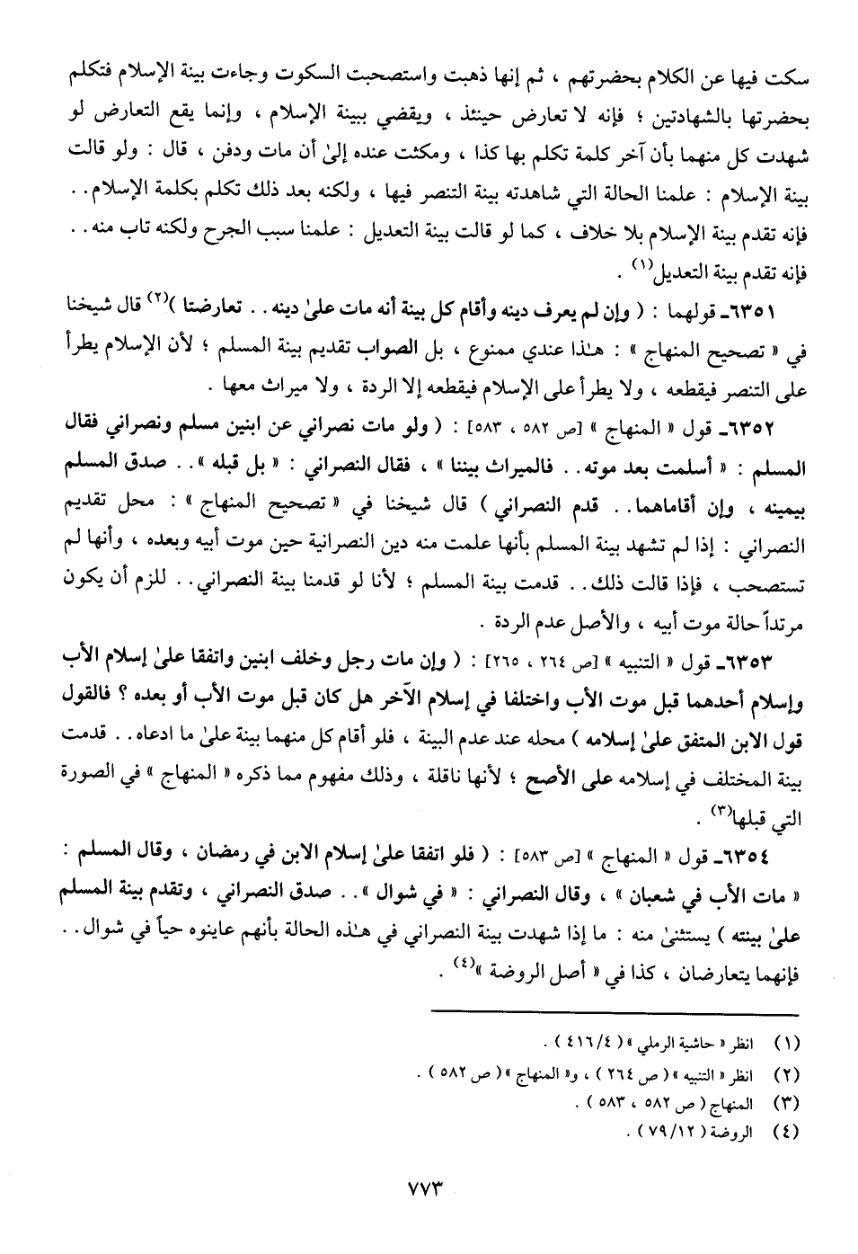 6354 - قول "المنهاج" [ص 583]: (فلو اتفقا على إسلام الابن في رمضان، وقال المسلم: "مات الأب في شعبان"، وقال النصراني: "في شوال" .. صدق النصراني، وتقدم بينة المسلم على بينته) يستثنى منه: ما إذا شهدت بينة النصراني في هذه الحالة بأنهم عاينوه حيًا في شوال .. فإنهما يتعارضان، كذا في "أصل الروضة" (¬4).