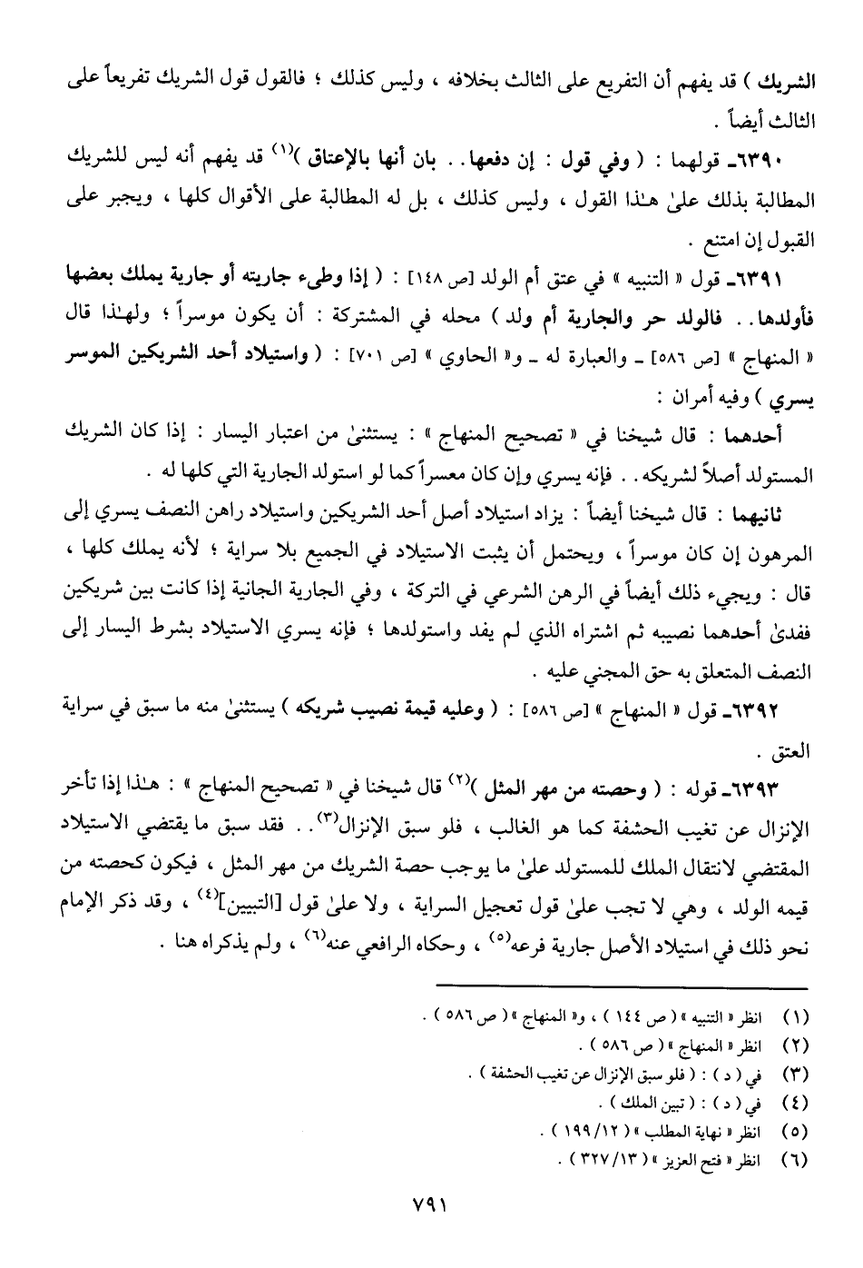 6391 - قول "التنبيه" في عتق أم الولد [ص 148]: (إذا وطئ جاريته أو جارية يملك بعضها فأولدها .. فالولد حر والجارية أم ولد) محله في المشتركة: أن يكون موسرًا؛ ولهذا قال "المنهاج" [ص 586]- والعبارة له - و"الحاوي" [ص 701]: (واستيلاد أحد الشريكين الموسر يسري) وفيه أمران: