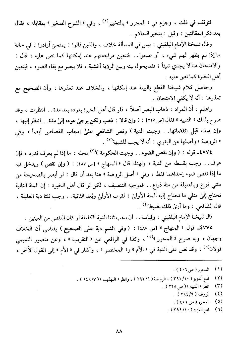 4774 - قوله: (وإن نقص الضوء .. وجبت الحكومة) (¬3) محله: ما إذا لم يعرف قدره، فإن عرف .. وجب بقسطه من الدية؛ ولهذا قال "المنهاج" [ص 487]: (وإن نقص) ويدخل فيه ما إذا نقص ضوء إحداهما فقط، وفي "أصل الروضة" هنا بعد أن قال: لو أبصر بالصحيحة من مئتي ذراع وبالعليلة من مئة ذراع .. فموجبه التنصيف، لكن لو قال أهل الخبرة: إن المئة الثانية تحتاج إلى مثلي ما تحتاج إليه المئة الأولى؛ لقرب الأولى وبُعد الثانية .. وجب ثلثا دية العليلة، قال الشافعي: وما أرى ذلك يضبط (¬4).