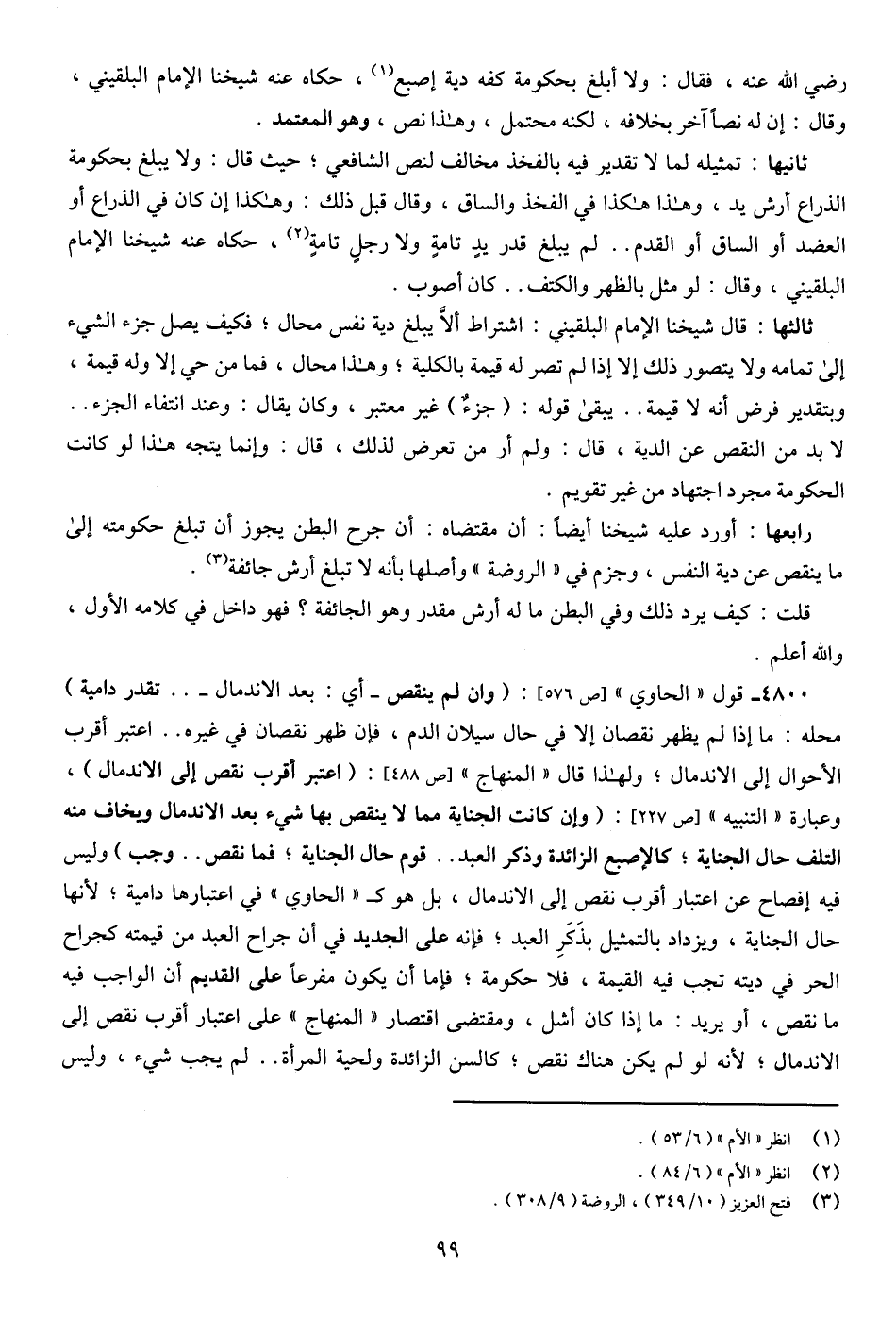4800 - قول "الحاوي" [ص 576]: (وإن لم ينقص - أي: بعد الاندمال - .. تقدر دامية) محله: ما إذا لم يظهر نقصان إلا في حال سيلان الدم، فإن ظهر نقصان في غيره .. اعتبر أقرب الأحوال إلى الاندمال؛ ولهذا قال "المنهاج" [ص 488]: (اعتبر أقرب نقص إلى الاندمال)، وعبارة "التنبيه" [ص 227]: (وإن كانت الجناية مما لا ينقص بها شيء بعد الاندمال ويخاف منه التلف حال الجناية؛ كالإصبع الزائدة وذكر العبد .. قوم حال الجناية؛ فما نقص .. وجب) وليس فيه إفصاح عن اعتبار أقرب نقص إلى الاندمال. بل هو كـ"الحاوي" في اعتبارها دامية؛ لأنها حال الجناية، ويزداد بالتمثيل بذَكَرِ العبد؛ فإنه على الجديد في أن جراح العبد من قيمته كجراح الحر في ديته تجب فيه القيمة، فلا حكومة؛ فإما أن يكون مفرعاً على القديم أن الواجب فيه ما نقص، أو يريد: ما إذا كان أشل، ومقتض اقتصار "المنهاج" على اعتبار أقرب نقص إلى الاندمال؛ لأنه لو لم يكن هناك نقص؛ كالسن الزائدة ولحية المرأة .. لم يجب شيء، وليس