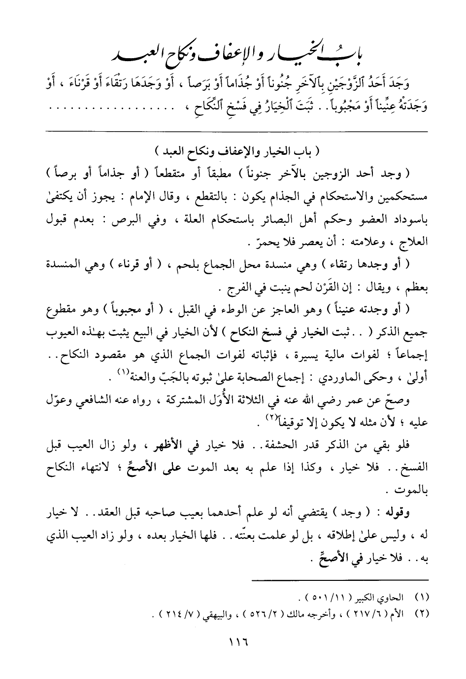 (وجد أحد الزوجين بالآخر جنونًا) مطبقًا أو متقطعًا (أو جذامًا أو برصًا) مستحكمين والاستحكام في الجذام يكون: بالتقطع، وقال الإمام: يجوز أن يكتفى باسوداد العضو وحكم أهل البصائر باستحكام العلة، وفي البرص: بعدم قبول العلاج، وعلامته: أن يعصر فلا يحمرّ.