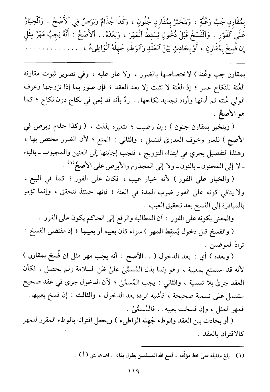 بمقارن جب وعُنة) لاختصاصها بالضرر، ولا عار عليه، وفي تصوير ثبوت مقارنة العُنة للنكاح عسر؛ إذ العُنة لا تثبت إلا بعد العقد؛ فإن صور بما إذا تزوجها وعرف الولي عُنته ثم أبانها وأراد تجديد نكاحها .. ردّ بأنه قد يُعن في نكاح دون نكاح؛ كما هو الأصحُّ.