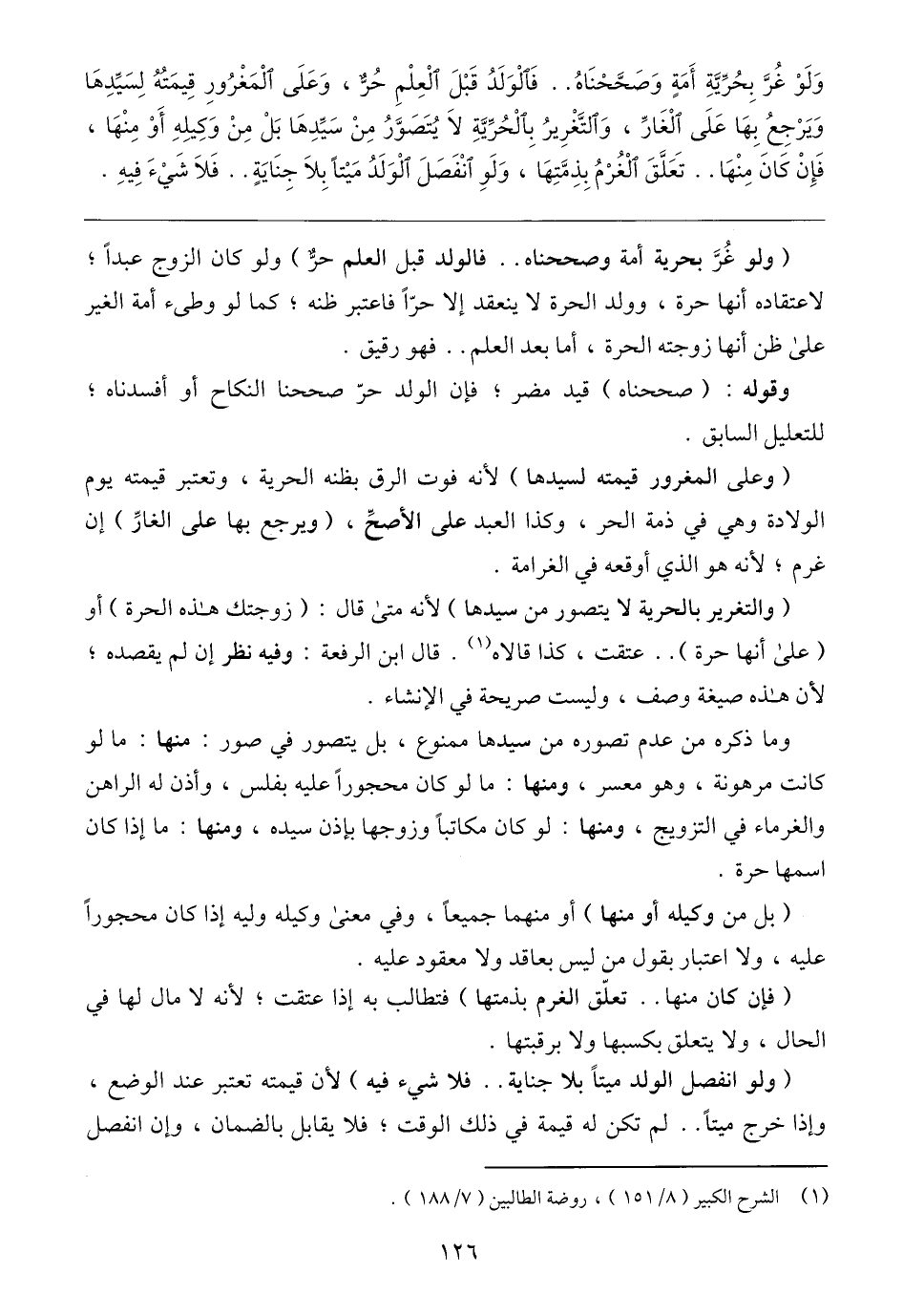 (ولو غُرَّ بحرية أمة وصححناه. . فالولد قبل العلم حرٌّ) ولو كان الزوج عبدًا؛ لاعتقاده أنها حرة، وولد الحرة لا ينعقد إلا حرًّا فاعتبر ظنه؛ كما لو وطئ أمة الغير على ظن أنها زوجته الحرة، أما بعد العلم. . فهو رقيق.