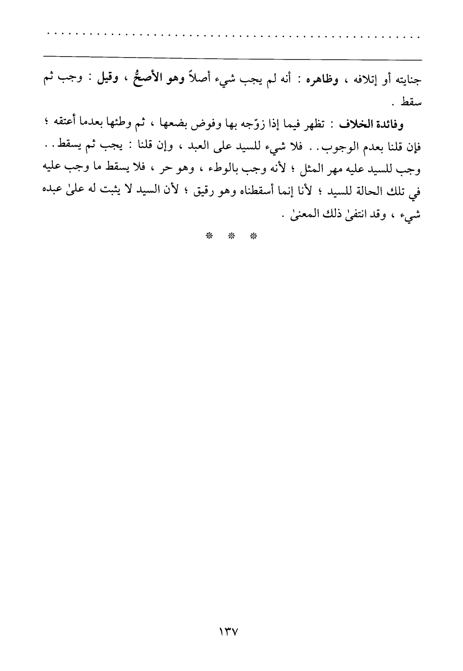 وفائدة الخلاف: تظهر فيما إذا زوّجه بها وفوض بضعها، ثم وطئها بعدما أعتقه؛ فإن قلنا بعدم الوجوب. . فلا شيء للسيد على العبد، وإن قلنا: يجب ثم يسقط. . وجب للسيد عليه مهر المثل؛ لأنه وجب بالوطء، وهو حر، فلا يسقط ما وجب عليه في تلك الحالة للسيد؛ لأنا إنما أسقطناه وهو رقيق؛ لأن السيد لا يثبت له على عبده شيء، وقد انتفى ذلك المعنى.