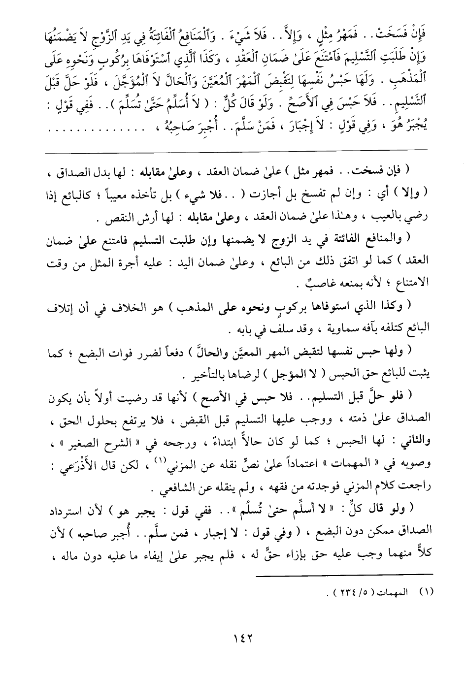 (ولها حبس نفسها لتقبض المهر المعيَّن والحالَّ) دفعًا لضرر فوات البضع؛ كما يثبت للبائع حق الحبس (لا المؤجل) لرضاها بالتأخير.