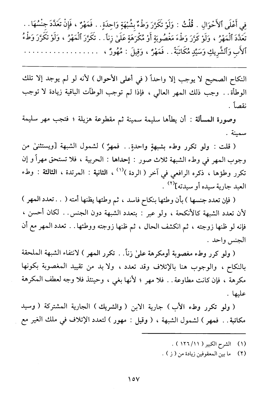 (قلت: ولو تكرر وطء بشبهةٍ واحدةٍ. . فمهرٌ) لشمول الشبهة [ويستثنى من وجوب المهر في وطء الشبهة ثلاث صور: إحداها: الحربية، فلا تستحق مهرًا وإن تكرر وطؤها، ذكره الرافعي في آخر (الردة) (١)، الثانية: المرتدة، الثالثة: وطء العبد جارية سيده أو سيدته] (٢).