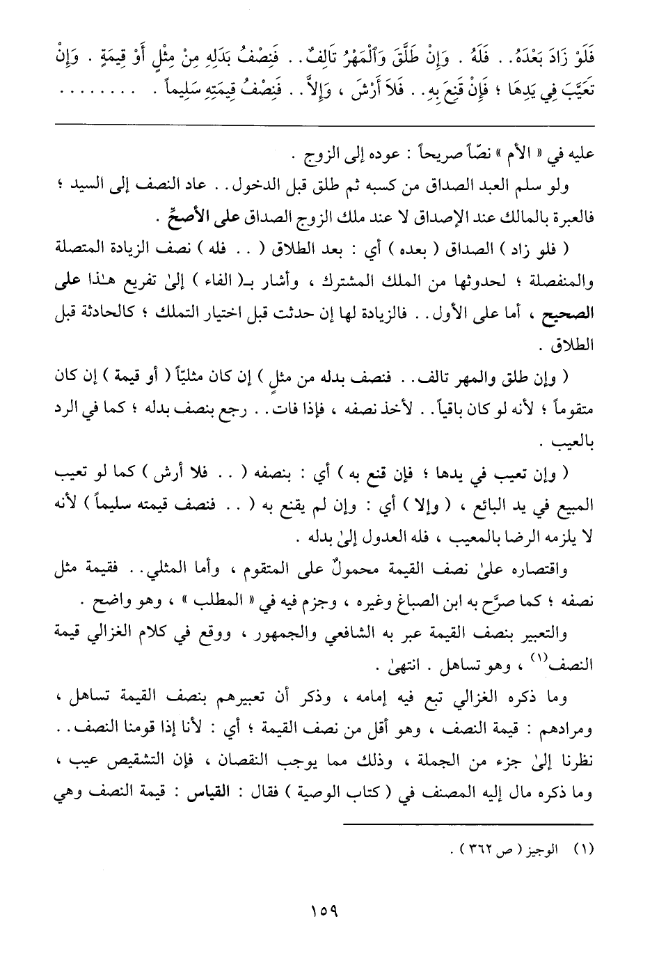 وما ذكره الغزالي تبع فيه إمامه، وذكر أن تعبيرهم بنصف القيمة تساهل، ومرادهم: قيمة النصف، وهو أقل من نصف القيمة؛ أي: لأنا إذا قومنا النصف. . نظرنا إلى جزء من الجملة، وذلك مما يوجب النقصان، فإن التشقيص عيب، وما ذكره مال إليه المصنف في (كتاب الوصية) فقال: القياص: قيمة النصف وهي