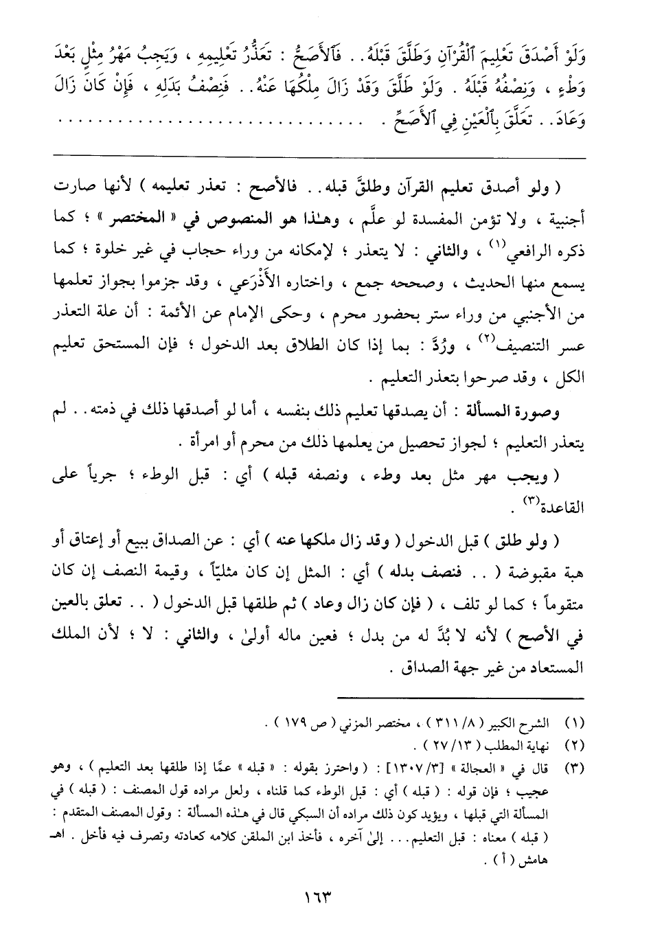 (٣) قال في "العجالة" [٣/ ١٣٠٧]: (واحترز بقوله: "قبله" عمَّا إذا طلقها بعد التعليم)، وهو عجيب؛ فإن قوله: (قبله) أي: قبل الوطء كما قلناه، ولعل مراده قول المصنف: (قبله) في المسألة التي قبلها، ويؤيد كون ذلك مراده أن السبكي قال في هذه المسألة: وقول المصنف المتقدم: (قبله) معناه: قبل التعليم. . . إلى آخره، فأخذ ابن الملقن كلامه كعادته وتصرف فيه فأخل. اهـ هامش (أ).