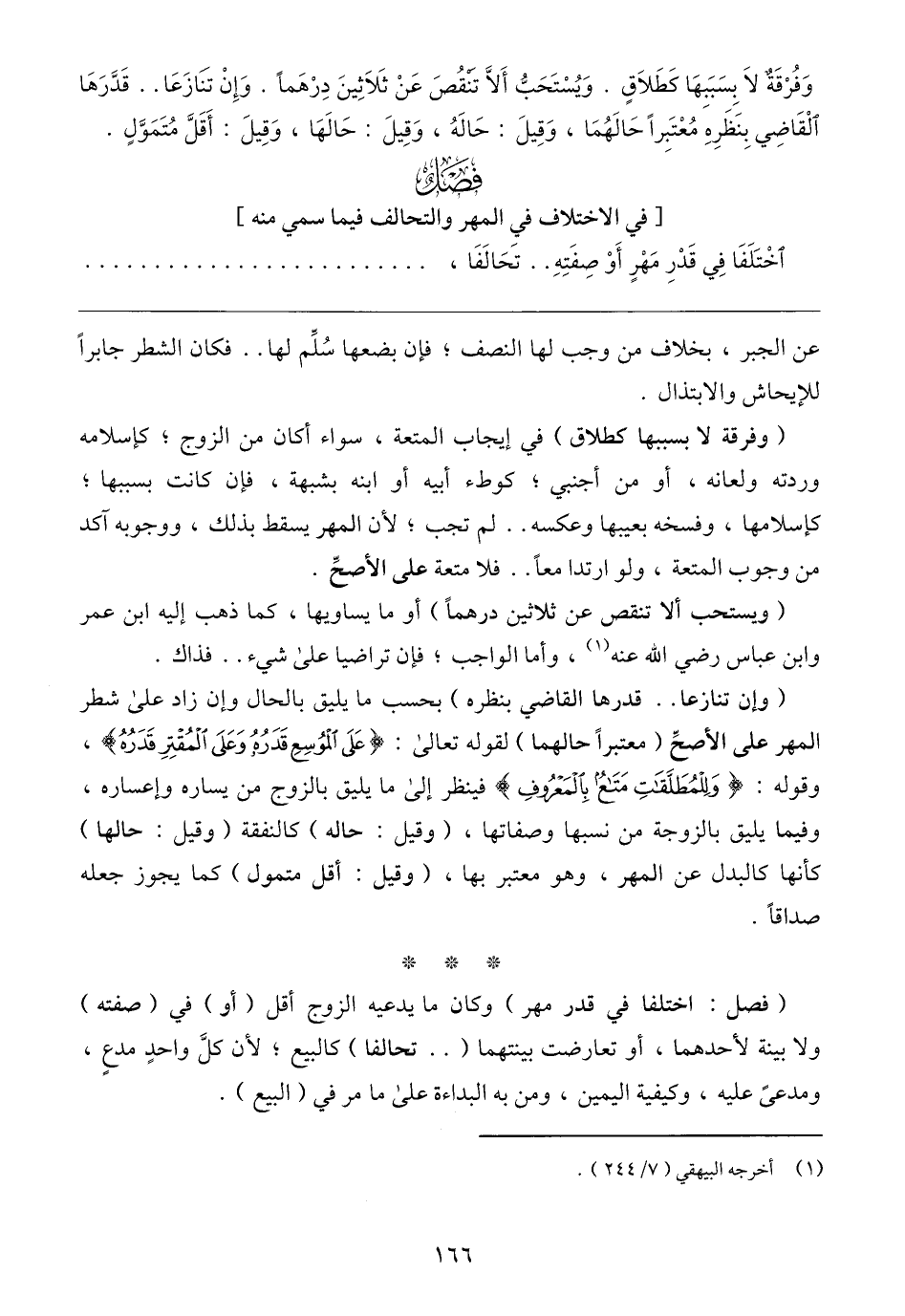 (وإن تنازعا. . قدرها القاضي بنظره) بحسب ما يليق بالحال وإن زاد على شطر المهر على الأصحِّ (معتبرًا حالهما) لقوله تعالى: {عَلَى الْمُوسِعِ قَدَرُهُ وَعَلَى الْمُقْتِرِ قَدَرُهُ}، وقوله: {وَلِلْمُطَلَّقَاتِ مَتَاعٌ بِالْمَعْرُوفِ} فينظر إلى ما يليق بالزوج من يساره وإعساره، وفيما يليق بالزوجة من نسبها وصفاتها، (وقيل: حاله) كالنفقة (وقيل: حالها) كأنها كالبدل عن المهر، وهو معتبر بها، (وقيل: أقل متمول) كما يجوز جعله صداقًا.