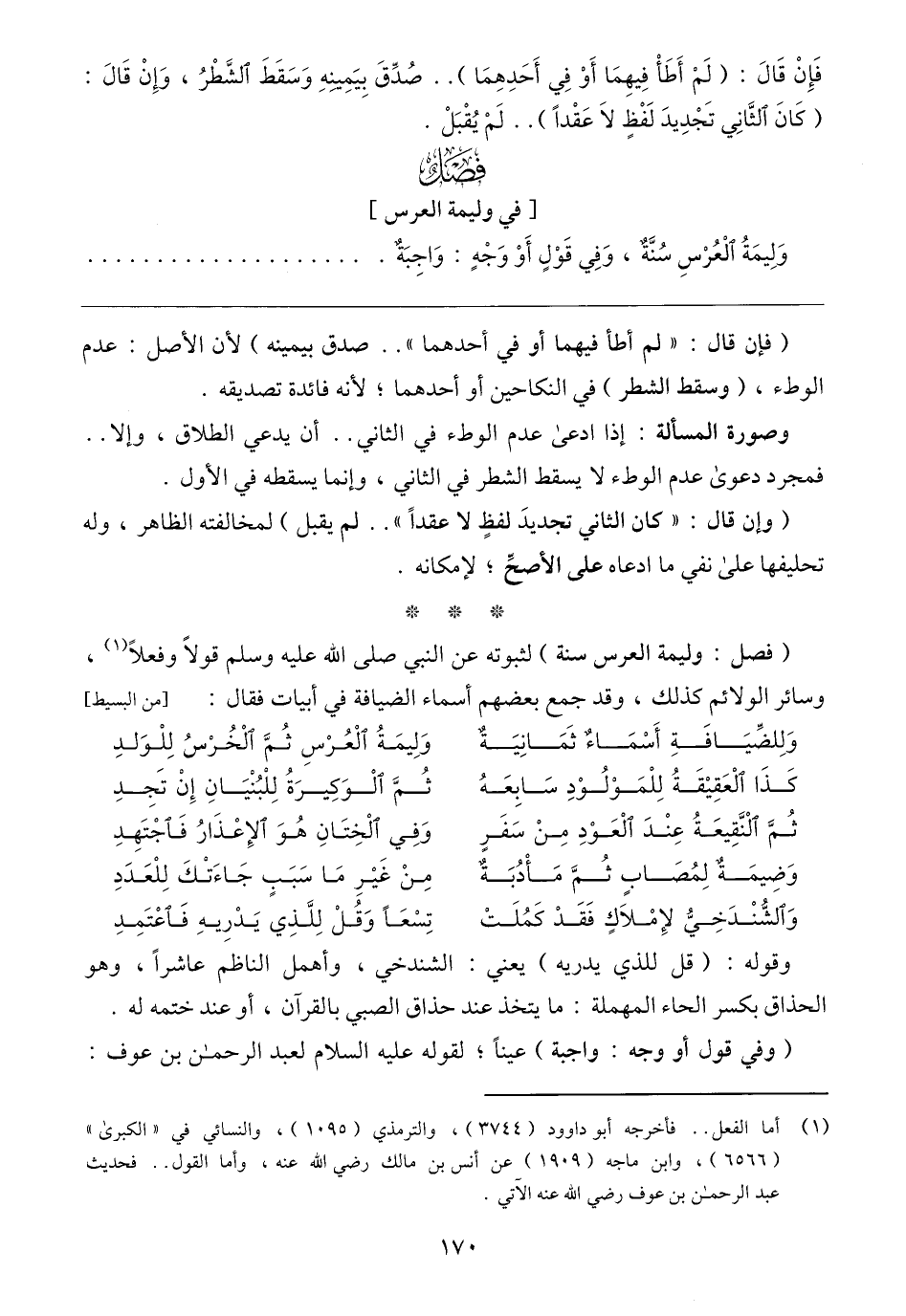 (فصل: وليمة العرس سنة) لثبوته عن النبي صلى الله عليه وسلم قولًا وفعلًا (١)، وسائر الولائم كذلك، وقد جمع بعضهم أسماء الضيافة في أبيات فقال: [من البسيط]