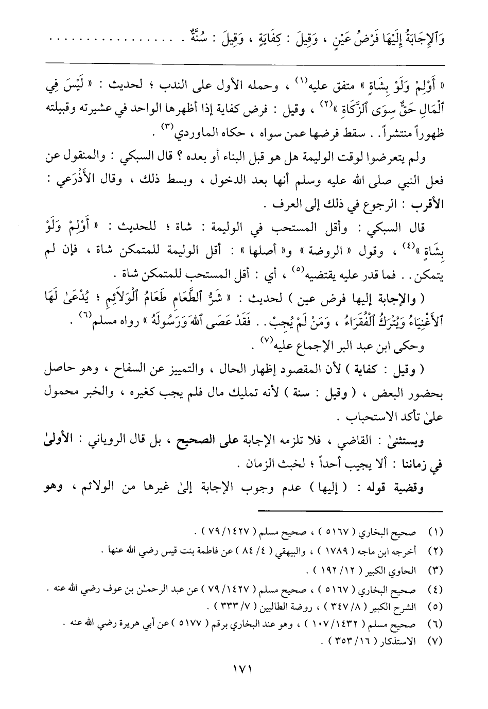 "أَوْلِمْ وَلَوْ بِشَاةٍ" متفق عليه (١)، وحمله الأول على الندب؛ لحديث: "لَيْسَ فِي الْمَالِ حَقٌّ سِوَى الزَّكَاةِ" (٢)، وقيل: فرض كفاية إذا أظهرها الواحد في عشيرته وقبيلته ظهورًا منتشرًا .. سقط فرضها عمن سواه، حكاه الماوردي (٣).