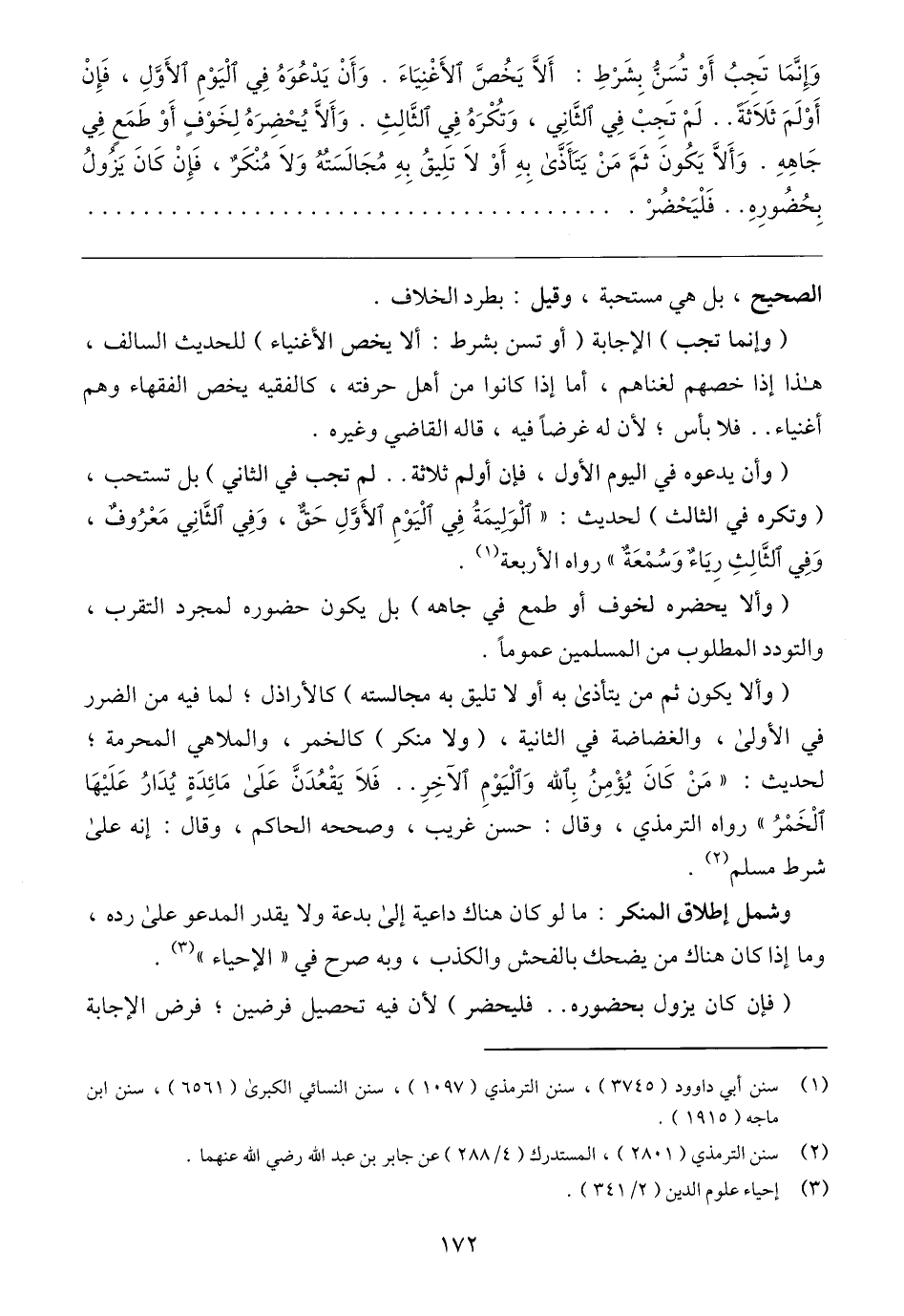 (وأن يدعوه في اليوم الأول، فإن أولم ثلاثة .. لم تجب في الثاني) بل تستحب، (وتكره في الثالث) لحديث: " الْوَلِيمَةُ فِي الْيَوْمِ الأَوَّلِ حَقٌّ، وَفِي الثَّانِي مَعْرُوفٌ، وَفِي الثَّالِثِ رِيَاءٌ وَسُمْعَةٌ" رواه الأربعة (١).