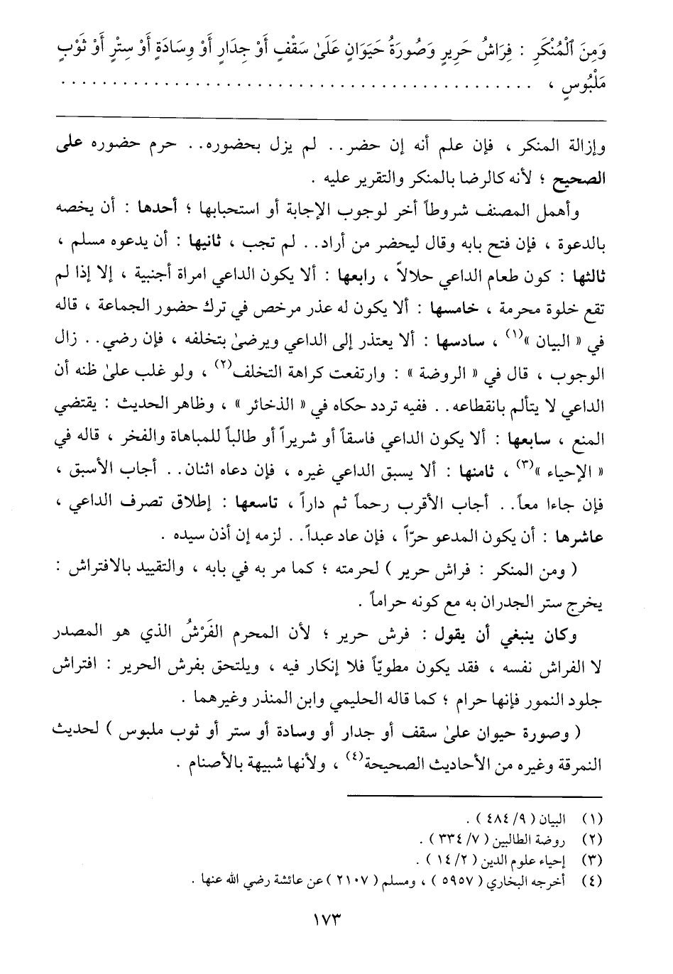 وأهمل المصنف شروطًا أخر لوجوب الإجابة أو استحبابها؛ أحدها: أن يخصه بالدعوة، فإن فتح بابه وقال ليحضر من أراد .. لم تجب، ثانيها: أن يدعوه مسلم، ثالثها: كون طعام الداعي حلالًا، رابعها: ألا يكون الداعي امراة أجنبية، إلا إذا لم تقع خلوة محرمة، خامسها: ألا يكون له عذر مرخص في ترك حضور الجماعة، قاله في "البيان" (١)، سادسها: ألا يعتذر إلى الداعي ويرضى بتخلفه، فإن رضي .. زال الوجوب، قال في "الروضة": وارتفعت كراهة التخلف (٢)، ولو غلب على ظنه أن الداعي لا يتألم بانقطاعه .. ففيه تردد حكاه في "الذخائر"، وظاهر الحديث: يقتضي المنع، سابعها: ألا يكون الداعي فاسقًا أو شريرًا أو طالبًا للمباهاة والفخر، قاله في "الإحياء" (٣)، ثامنها: ألا يسبق الداعي غيره، فإن دعاه اثنان .. أجاب الأسبق، فإن جاءا معًا .. أجاب الأقرب رحمًا ثم دارًا، تاسعها: إطلاق تصرف الداعي، عاشرها: أن يكون المدعو حرًّا، فإن عاد عبدًا .. لزمه إن أذن سيده.