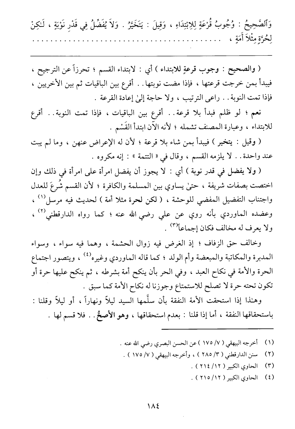 (ولا يفضل في قدر نوبة) أي: لا يجوز أن يفضل امرأة على امرأة في ذلك وإن اختصت بصفات شريفة، حتى يساوي بين المسلمة والكافرة؛ لأن القسم شُرعَ للعدل واجتناب التفضيل المفضي للوحشة، (لكن لحرة مثلا أمة) لحديث فيه مرسل (١)، وعضده الماوردي بأنه روي عن علي رضي الله عنه؛ كما رواه الدارقطني (٢)، ولا يعرف له مخالف فكان إجماعًا (٣).