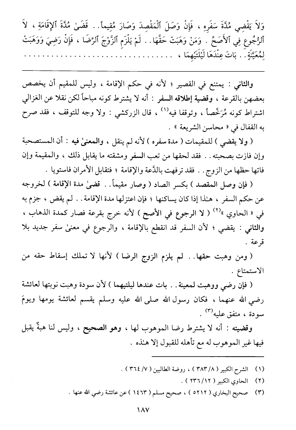 والثاني: يمتنع في القصير؛ لأنه في حكم الإقامة، وليس للمقيم أن يخصص بعضهن بالقرعة، وقضية إطلاقه السفر: أنه لا يشترط كونه مباحًا لكن نقلا عن الغزالي اشتراط كونه مُرَخَّصًا، وتوقفا فيه (١)، قال الزركشي: ولا وجه للتوقف، فقد صرح به القفال في "محاسن الشريعة".