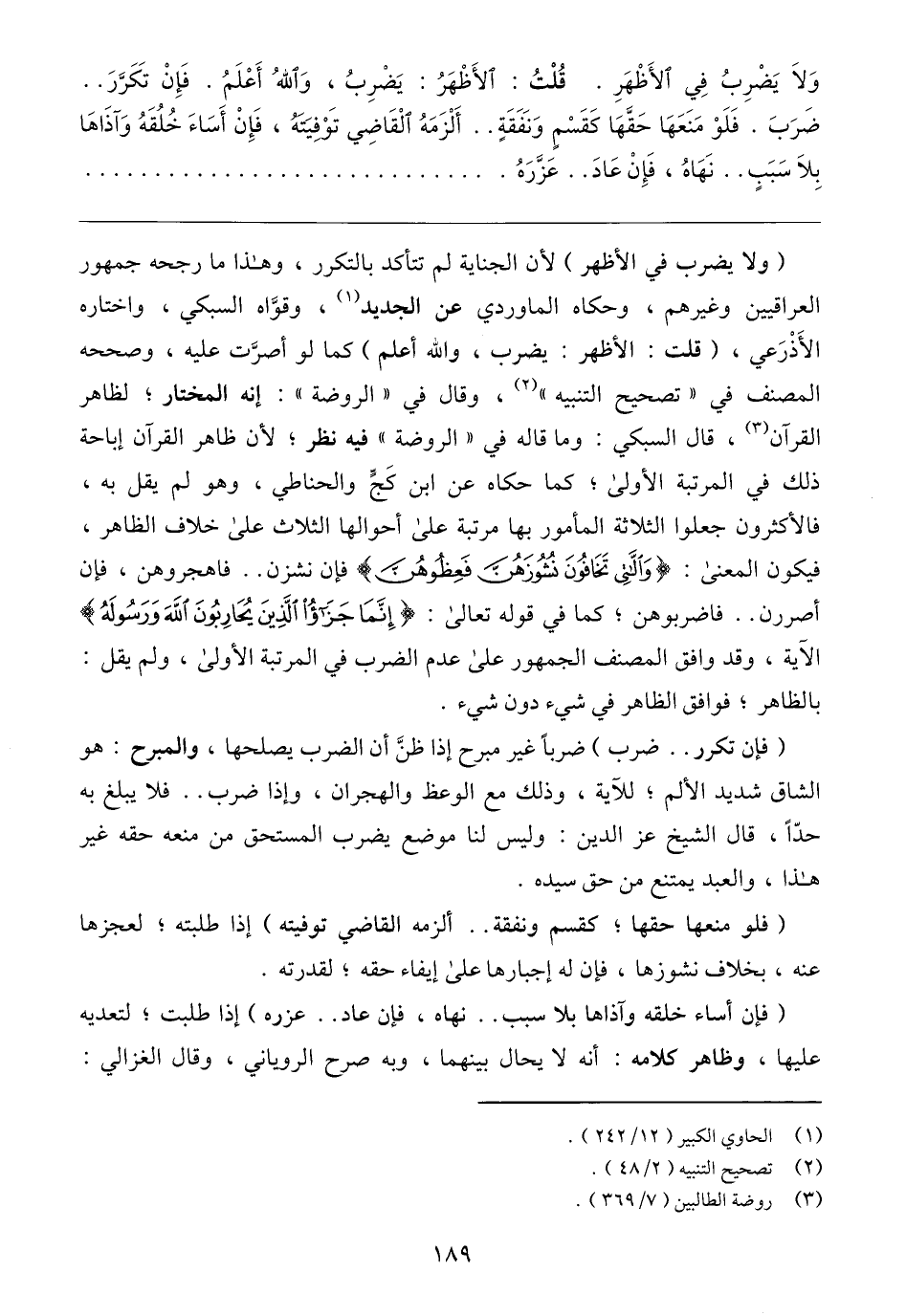(ولا يضرب في الأظهر) لأن الجناية لم تتأكد بالتكرر، وهذا ما رجحه جمهور العراقيين وغيرهم، وحكاه الماوردي عن الجديد (١)، وقوَّاه السبكي، واختاره الأَذْرَعي، (قلت: الأظهر: يضرب، والله أعلم) كما لو أصرَّت عليه، وصححه المصنف في "تصحيح التنبيه" (٢)، وقال في "الروضة": إنه المختار؛ لظاهر القرآن (٣)، قال السبكي: وما قاله في "الروضة" فيه نظر؛ لأن ظاهر القرآن إباحة ذلك في المرتبة الأولى، كما حكاه عن ابن كَجٍّ والحناطي، وهو لم يقل به، فالأكثرون جعلوا الثلاثة المأمور بها مرتبة على أحوالها الثلاث على خلاف الظاهر، فيكون المعنى: {وَاللَّاتِي تَخَافُونَ نُشُوزَهُنَّ فَعِظُوهُنَّ} فإن نشزن .. فاهجروهن، فإن أصررن .. فاضربوهن؛ كما في قوله تعالى: {إِنَّمَا جَزَاءُ الَّذِينَ يُحَارِبُونَ اللَّهَ وَرَسُولَهُ} الآية، وقد وافق المصنف الجمهور على عدم الضرب في المرتبة الأولى، ولم يقل: بالظاهر؛ فوافق الظاهر في شيء دون شيء.